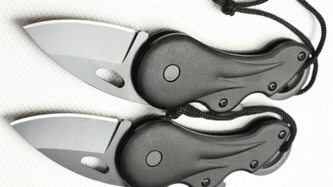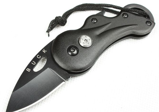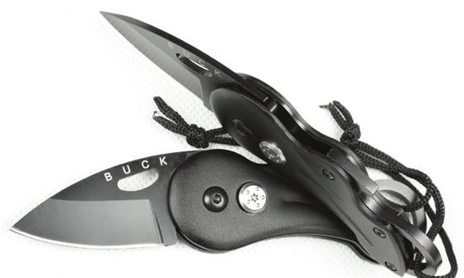 巴克凤眼折刀 刃材:440 硬度: 57HRC 全长:13CM 刃长:5CM 刃厚: 0.25CM 刃宽:2.8CM (最宽处) 柄长: 9CM 涂层:发黑 柄材: 金属铝 重量:90克 锁定:线锁
