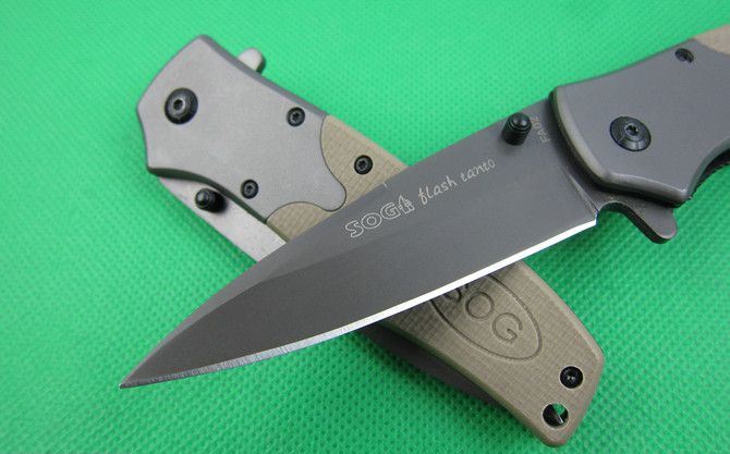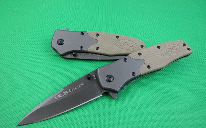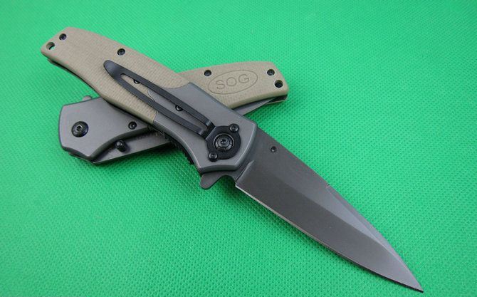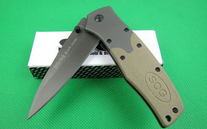 SOG.FA02快开折刀(沙漠色) 全长:20.8cm 刃长:9cm 柄长:11.7cm 刃厚:0.27cm 刃宽:2.8cm 刃材:5Cr13 柄材:G10+钢头 硬度:56HRC 净重;170克 锁定;线锁 表面处:镀钛 其他:原厂彩盒