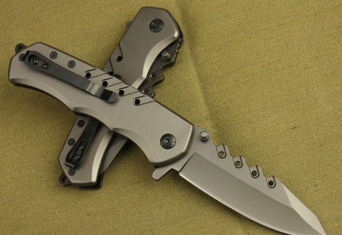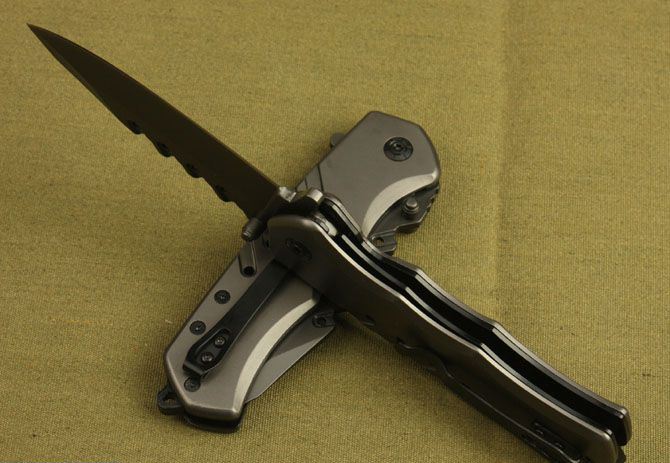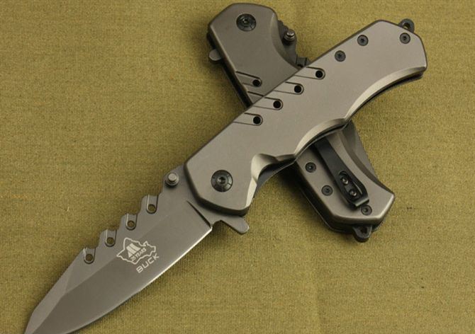 巴克DA23折刀 全 长:22.5cm 刃 长:9.5cm 柄 长:12.5cm 刃 厚:0.36cm 刃 材:3Cr13 柄 材:全钢 硬 度:55HRC 表 面:灰钛 重 量:310g 锁 定: 快开