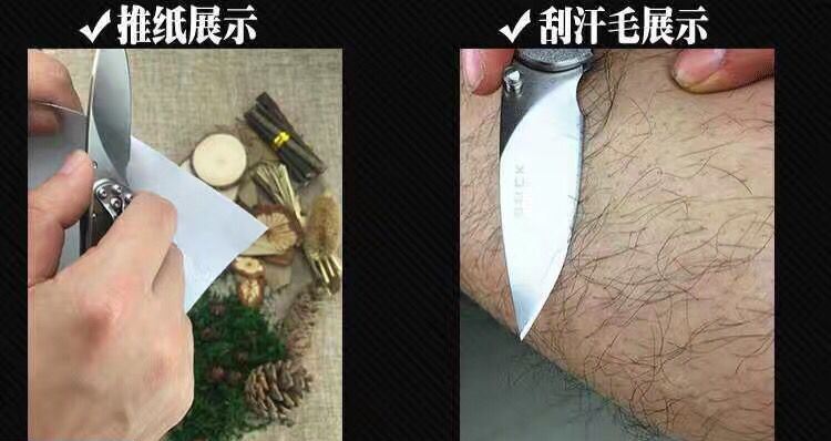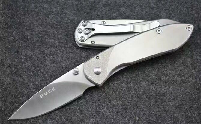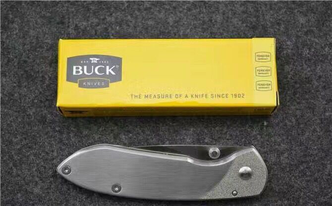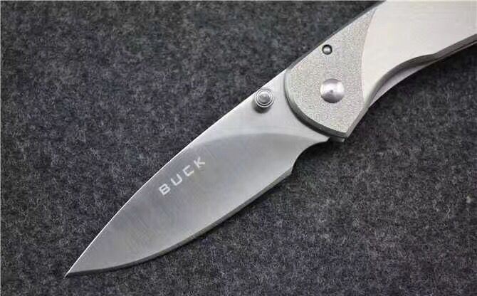 巴克327折刀钢本色 全 长:16cm 刃 长:6.7cm 柄 长:9.5cm 刃 厚:0.24cm 刃 材:5Cr13 柄 材:全钢 硬 度:56HRC 表 面:灰钛和砂光 重 量:96g 锁 定:侧锁