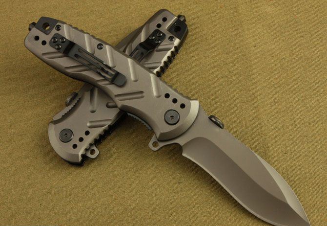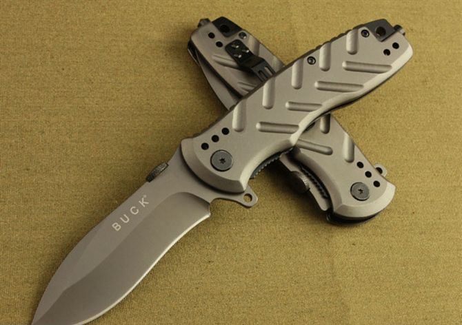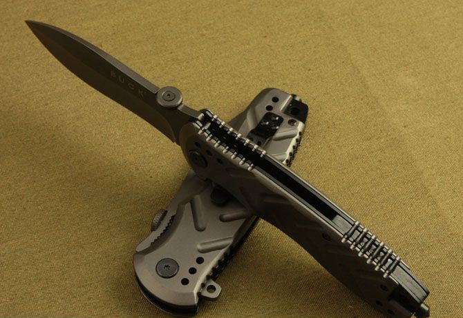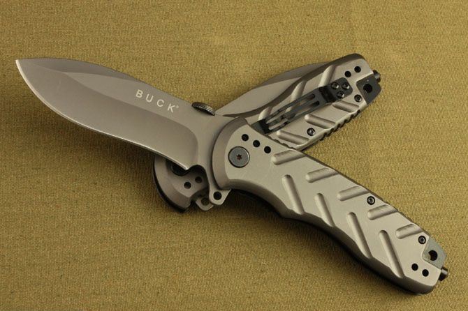 巴克—B39折刀 全长:23cm 刃长:9.5cm 柄长:13cm 刃厚:3.7mm 刃材: 3Cr13 柄材: 钢片 硬度: 55HRC 重量:320克 表面处理:灰钛 锁型:快开