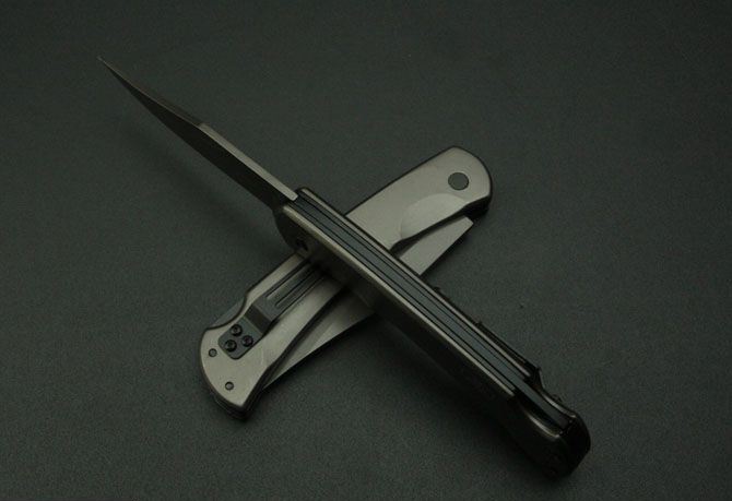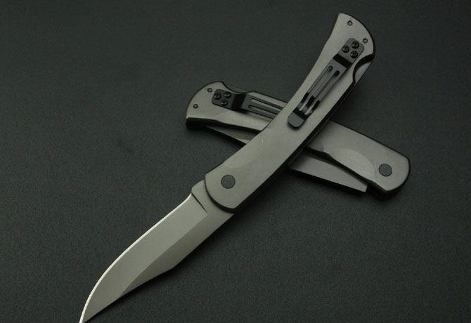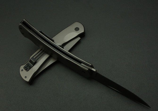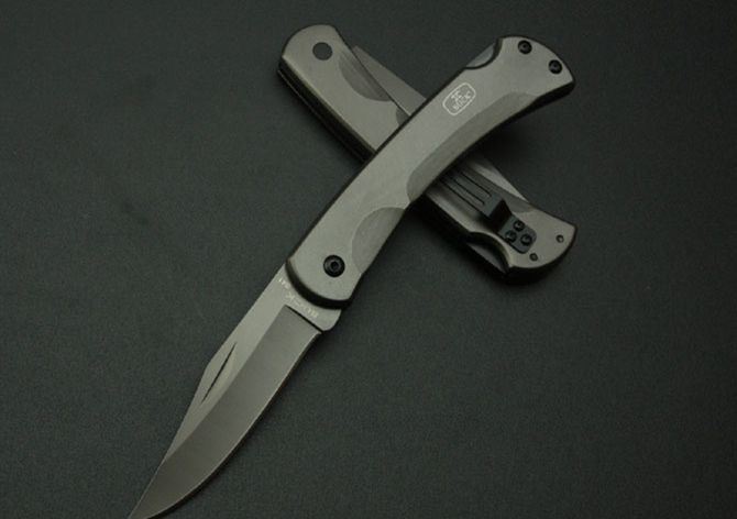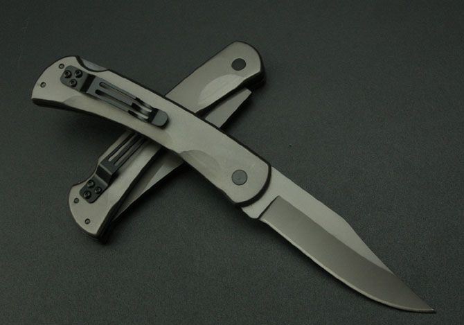 巴克—B41全钢折刀 全长:21.5cm 刃长:8.7cm 柄长:12.2cm 刃厚:2.8mm 刃材: 5Cr13 柄材: 全钢 硬度: 56HRC 重量:240克(含刀套) 表面处理:灰钛 锁型:制尾