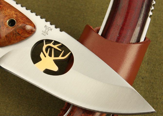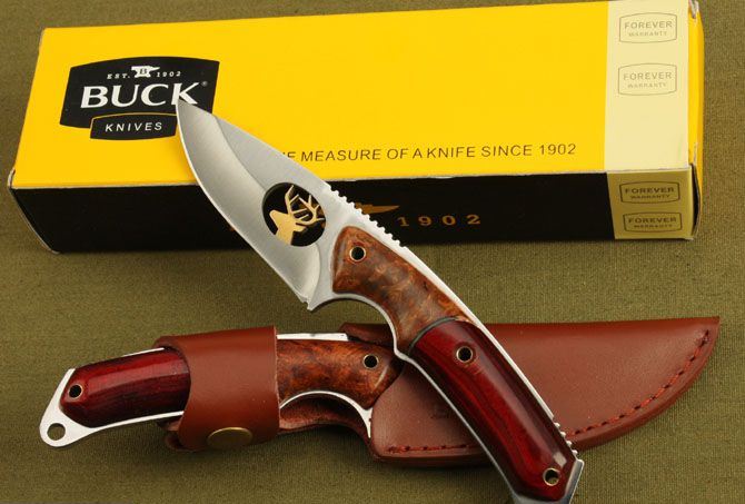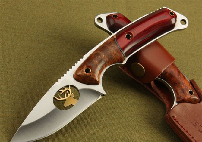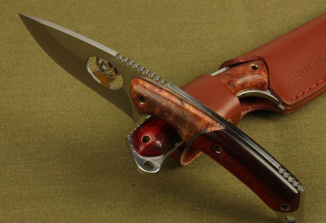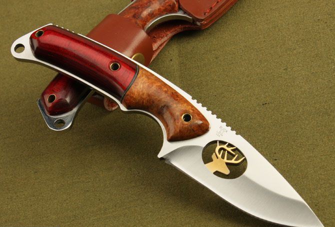 巴克金鹿猎刀 全长:200mm 刃长:80mm 刃厚:3.7mm 刃宽: 35mm 刃材: 9Cr 柄材: 红檀和红影木 硬度: 59HRC 重量:235g(含包装) 刀套:牛皮