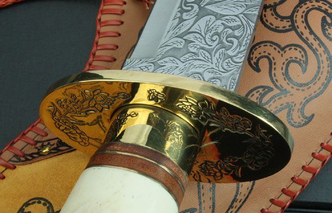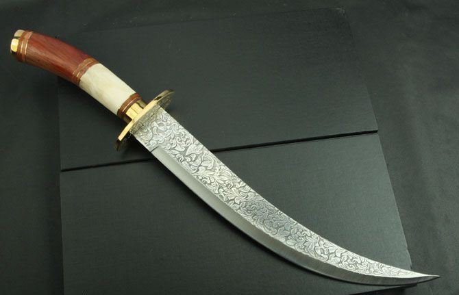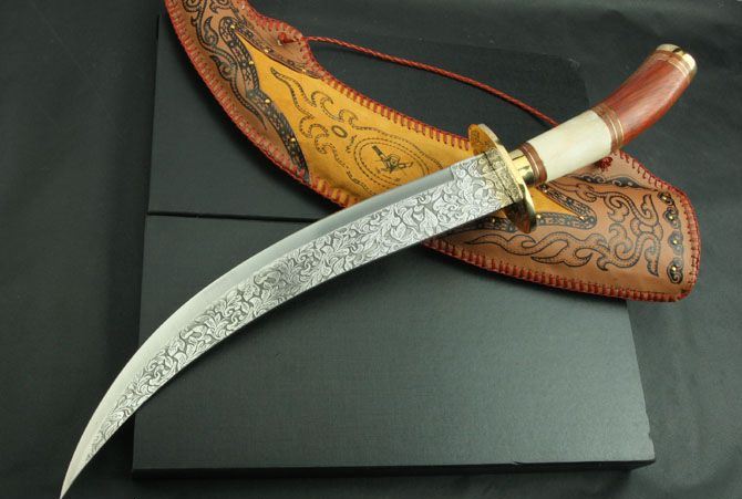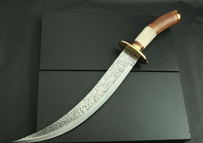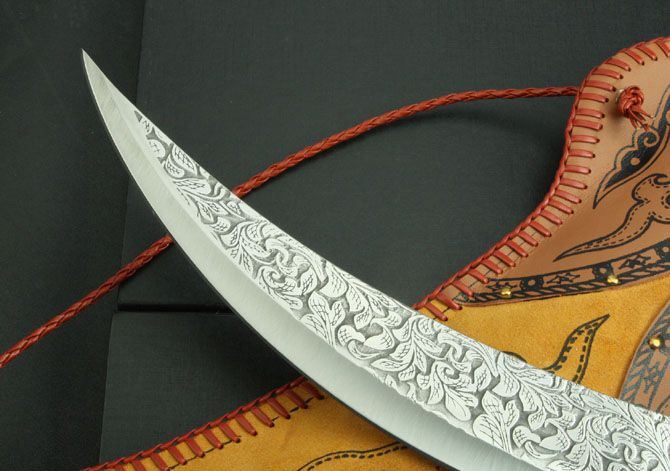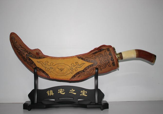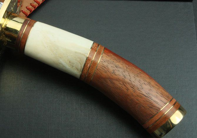蒙古大弯刀 全 长:560mm 刃 长:340mm 柄 长:185mm 刃 宽:35mm 刃 厚:4mm 刃 材:5Cr13Mov 重 量:1500g(含包装) 硬 度:57HRC 表 面:腐蚀 柄 材:铜头+兽骨+铜片+皮片+红木 锁 型:定锁 其 他:配牛手工皮套