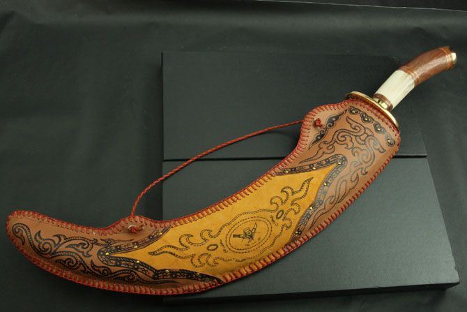 全 长:560mm 刃 长:340mm 柄 长:185mm 刃 宽:35mm 刃 厚:4mm 刃 材:5Cr13Mov 重 量:1500g(含包装) 硬 度:57HRC 表 面:腐蚀 柄 材:铜头+兽骨+铜片+皮片+红木 锁 型:定锁 其 他:配牛手工皮套