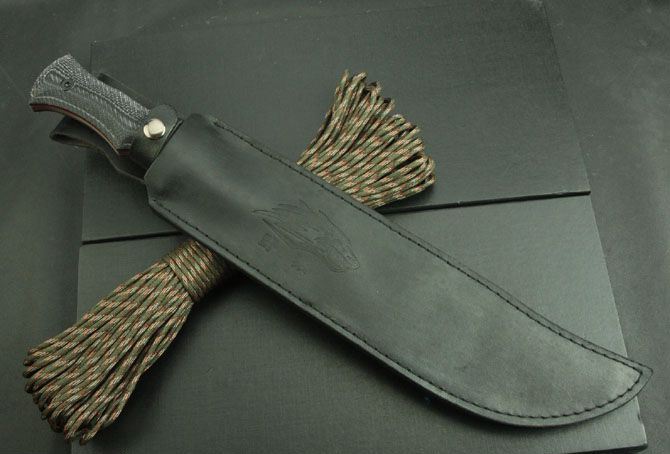 野狼大砍刀 全 长:445mm 刃 长:30mm 柄 长:125mm 刃 宽:60mm 刃 厚:6mm 刃 材:5Cr13Mov 重 量:1080g(含包装) 硬 度:56HRC 表 面:砂光 柄 材:米克塔 锁 型:定锁 其 他:配皮套和纸盒