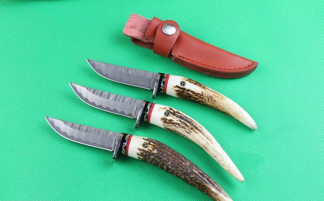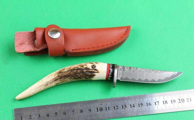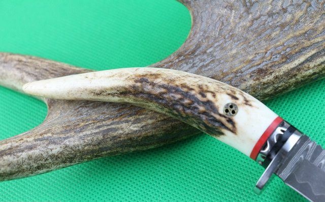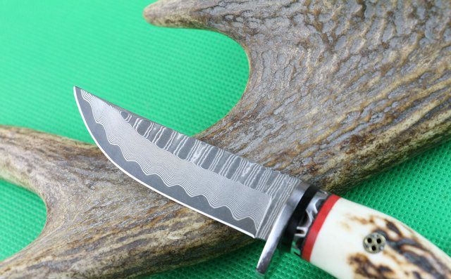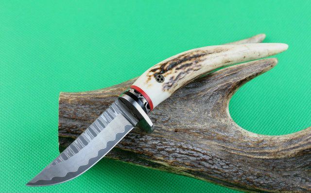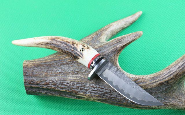 鹿角HY115大马士革工艺刀 全 长:19.5cm 刃 长:8cm 柄 长:约11.5cm 刃 厚:2.8mm 刃 材:大马士革钢 硬 度:57HRC 刀 柄:鹿角+雕花钢头+铜钉 表 面:大马士革花纹 重 量:120.0克 备 注:带真皮套