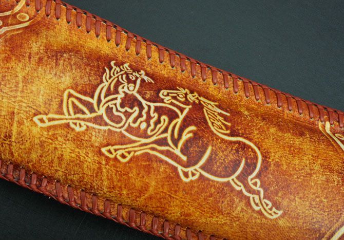 蒙古大马刀 全 长:678mm 刃 长:420mm 柄 长:210mm 刃 宽:47mm 刃 厚:4.2mm 刃 材:5Cr13Mov 重 量:1800g(含包装) 硬 度:57HRC 表 面:腐蚀 柄 材:铜头+兽骨+铜片+皮片 锁 型:定锁 其 他:配牛手工皮套