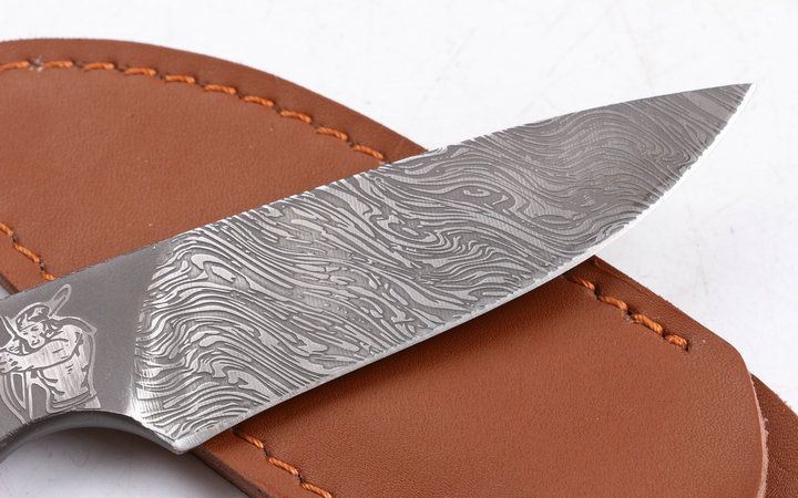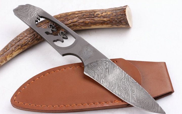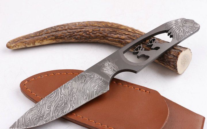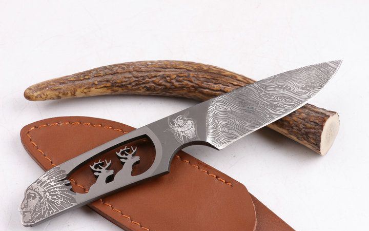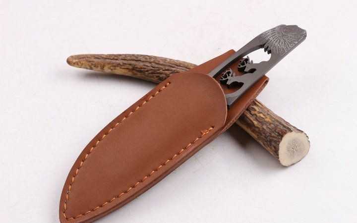 印第安—鹿头刀 全 长: 20.1cm 刃 长: 9.5cm 柄 长: 11.5cm 刃 厚: 4.9mm 刃 材: 7Cr17MOV 硬 度: 58HRC 总 重: 130克 净 重: 105克 表 面: 腐蚀图案 柄 材: 一体龙骨 刀 鞘: 皮套 其 它: 刀口锋利