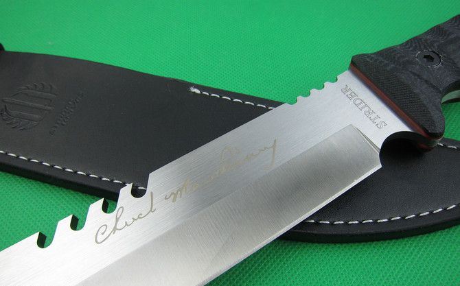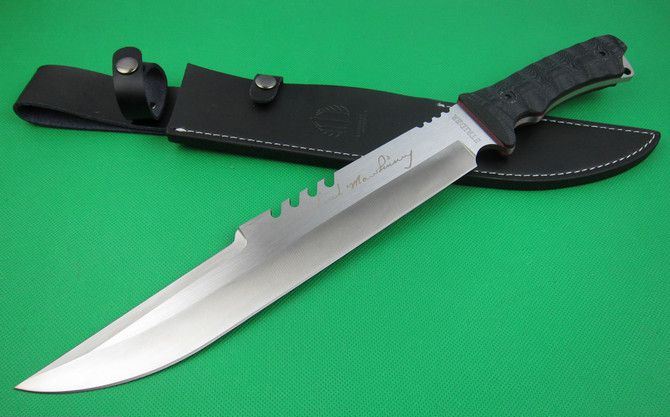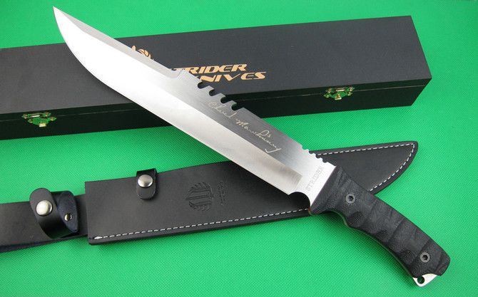 米克手签版长刀3号 全 长:448mm 刃 长:300mm 柄 长:132mm 刃 宽:52mm 刃 厚:5.7mm 刃 材:7Cr17Mov 刀 重;680g 重 量:1160g(含包装) 硬 度:58HRC 表 面:镜光拉丝 柄 材:黑色G10 其 他:木盒和牛皮套