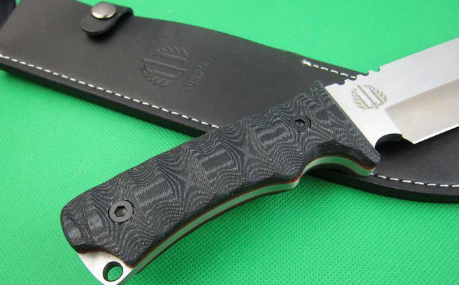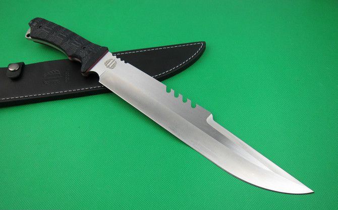 全 长:448mm 刃 长:300mm 柄 长:132mm 刃 宽:52mm 刃 厚:5.7mm 刃 材:7Cr17Mov 刀 重;680g 重 量:1160g(含包装) 硬 度:58HRC 表 面:镜光拉丝 柄 材:黑色G10 其 他:木盒和牛皮套