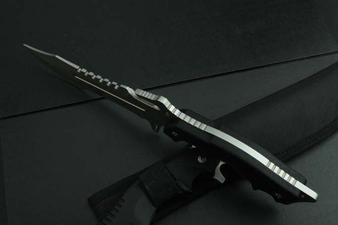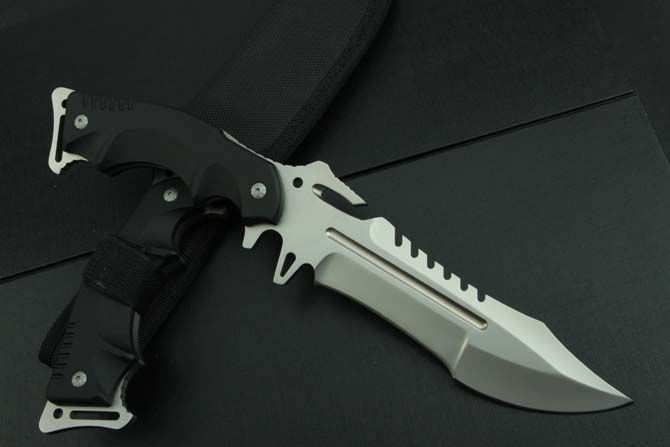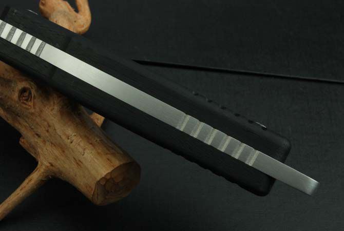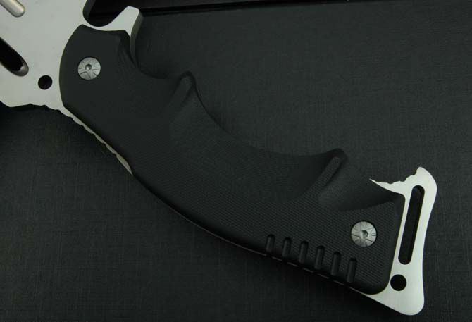 全 长:325mm 刃 长:150mm 柄 长:145mm 刃 宽:4mm 刃 厚:6.2mm 刃 材:5Cr13Mov 重 量:590g(含包装) 硬 度:56HRC 表 面:氧化灰 柄 材:黑G10 锁 型:定锁 其 他:配牛皮纸盒和尼龙套