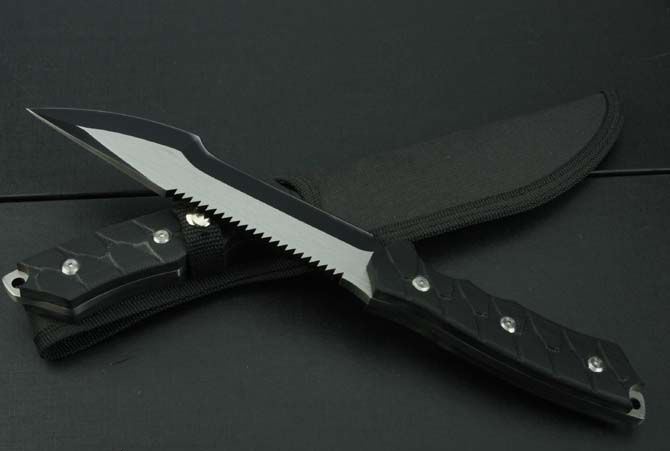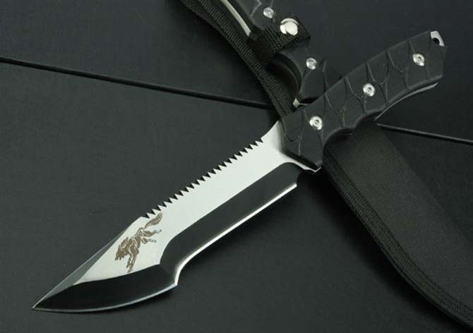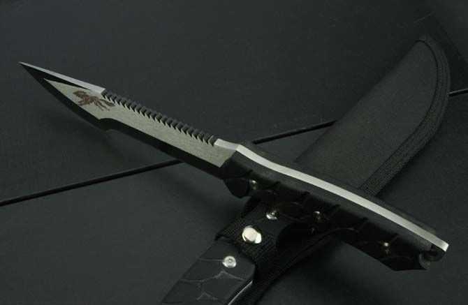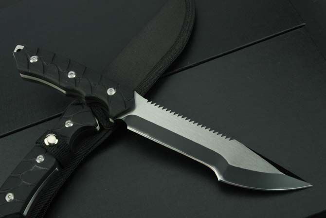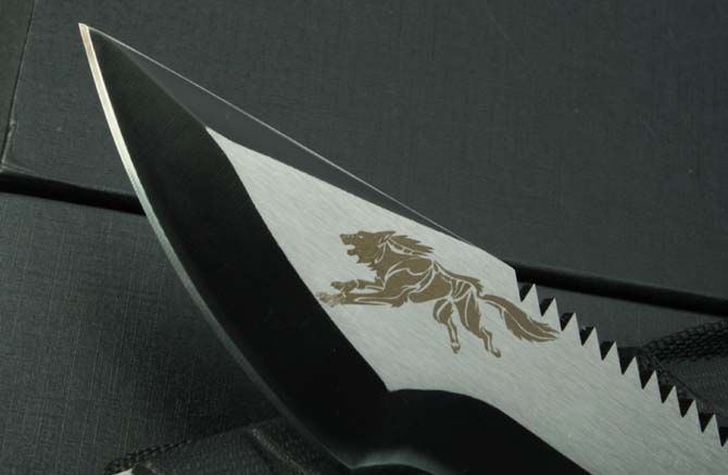 豺狼直刀 全 长:313mm 刃 长:170mm 柄 长:140mm 刃 宽:42mm 刃 厚:5.5mm 刃 材:5Cr13Mov 重 量:499g(含包装) 硬 度:57HRC 表 面:砂光+氧化黑 柄 材:黑色G10 锁 型:定锁 其 他:配尼龙套和纸盒