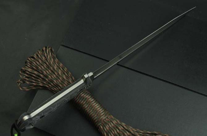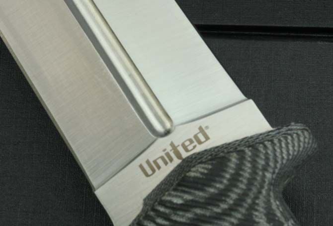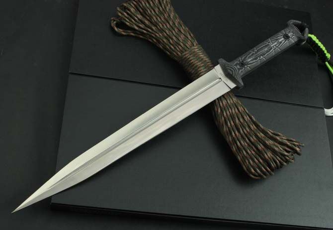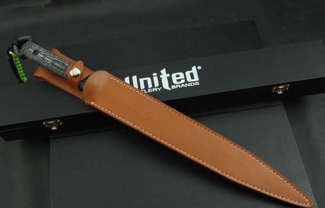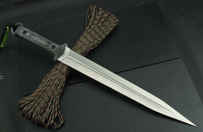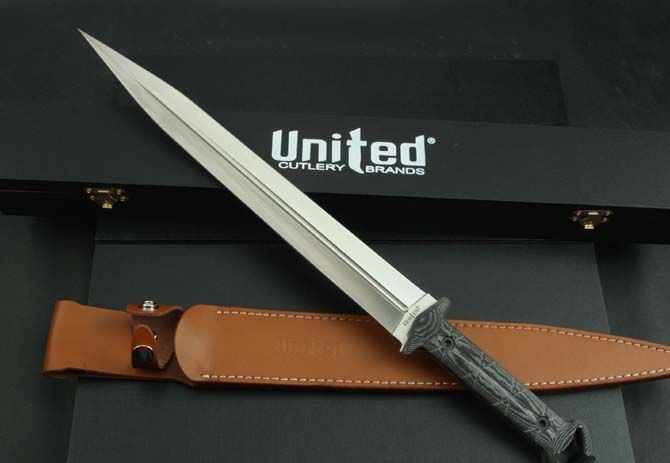 联合刀具剑魔双锋 全 长:48cm 刃 长:32cm 柄 长:15cm 刃 宽:3.7cm 刃 厚:5.5mm 刃 材:5Cr13Mov 重 量:570g(含包装) 硬 度:57HRC 表 面:砂光 柄 材:米卡塔 锁 型:定锁 其 他:纸盒和皮套