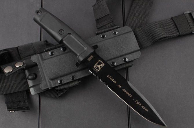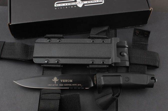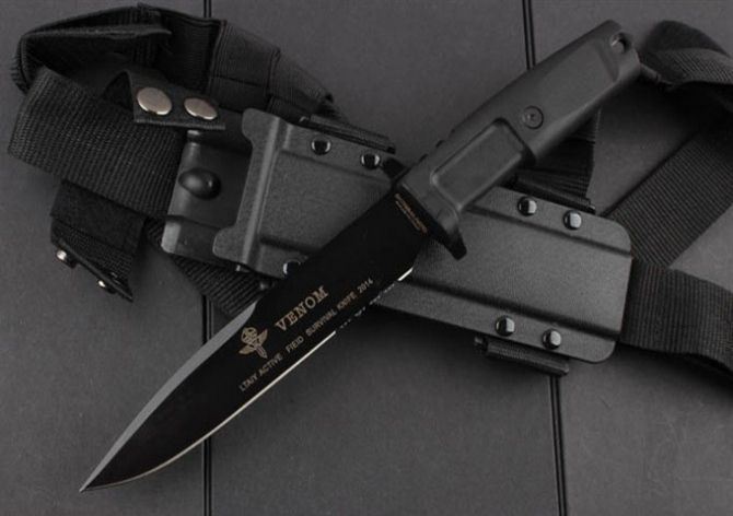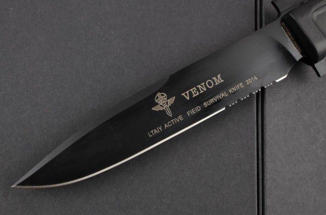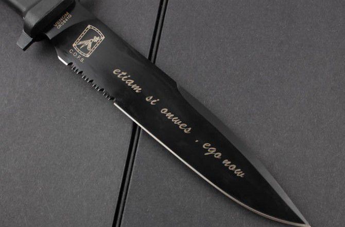 这把VENOM是意大利现役特殊全功能格斗防卫刀,由C.O.F.S.(特种作战部队Operativo Forze Speciali,模仿英国特种空勤部队S.A.S.成立的一支部队)及其指挥官Gen.Bertolini监制,并听取一些国际知名刀具收藏家的意见而最终完成的。从而制作出该款定制格言励志版刀具,这在意大利军事历史上也称得上是一次真正的重大贡献。 这把刀确切的起源是特种部队绶予对战功及有重大功勋人员,我们已经从这种型号的刀具型号及徽章中看到。这种刀具在意大利人手中,这种型号的刀具得到一些改进,从1939年创造了意大利空降突击部队的伞兵版产品。随后,极端武力公司在保持原始刀具的形状和大小的基础上,通过现代挂科技和材料制作出符合军事规格的C.O.F.S.防卫格斗刀系列。 这把刀刀身采用类全功能型设计,平磨的刃部非常锋利。刀柄使用Forprene树脂材料经防滑处理,这种状态的手柄非常容易进行清洁,且性能远远超过1939年版本产品。这把刀的正面和刀身背面还印有一个独特的单位徽章,背面写有这支部队的座右铭是“ETIAM SIOMNES, EGO NOW”,意思是“即便所有人都会退缩...我也绝不!”Extrema Ratio意大利极端武力VENOM毒液黑色刃三分之一齿特种荣誉版博伊格斗刀