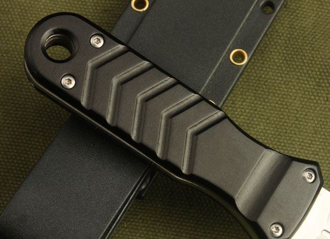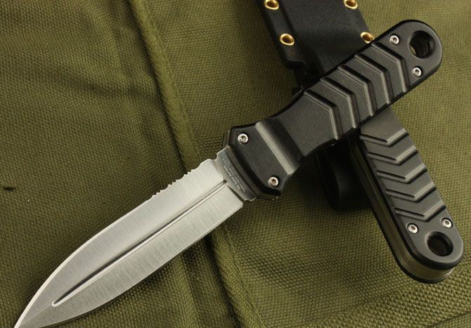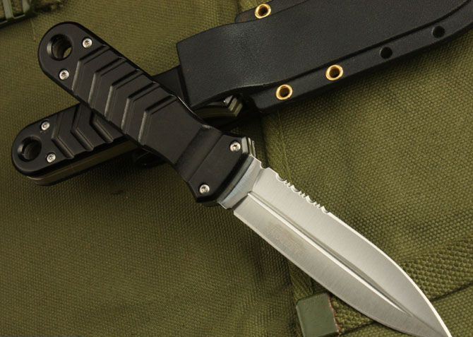 边齿双锋(白色) 全长:18.5cm 刃长:9.5cm 柄长:9cm 刃厚:2.8mm 刃材: 3Cr13 刀重:150克 硬度: 55HRC 柄材: 铝 刀鞘:ABS 刃面处理:砂光