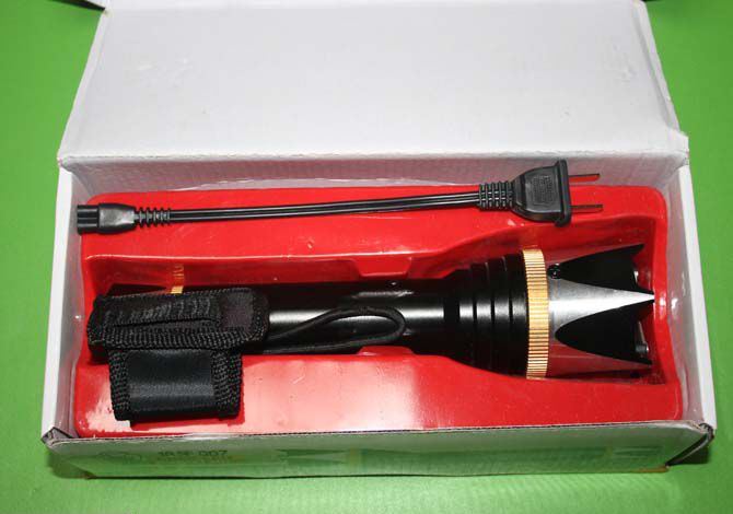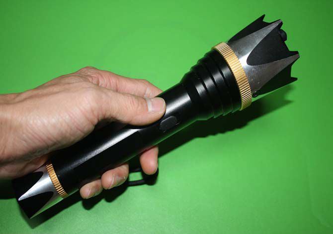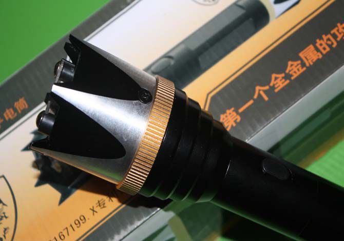 产品参数: 尺寸:长24厘米*头部直径5.5厘米*尾部直径3厘米 电压:20万伏 照明:100米左右。强光+弱光+爆闪 颜色:黑色 材质:航空铝合金材质外壳,金属防卫攻击头 灯泡:进口LED灯珠,铝合金内饰灯杯 功能:电击+z照明,可击碎钢化玻璃 电池:内置的镍氢电池 用途:适合家用防身,旅游,野营,野外探险,商务馈赠