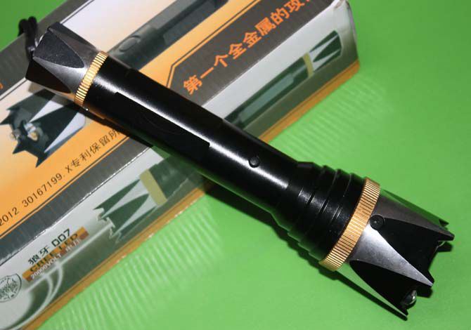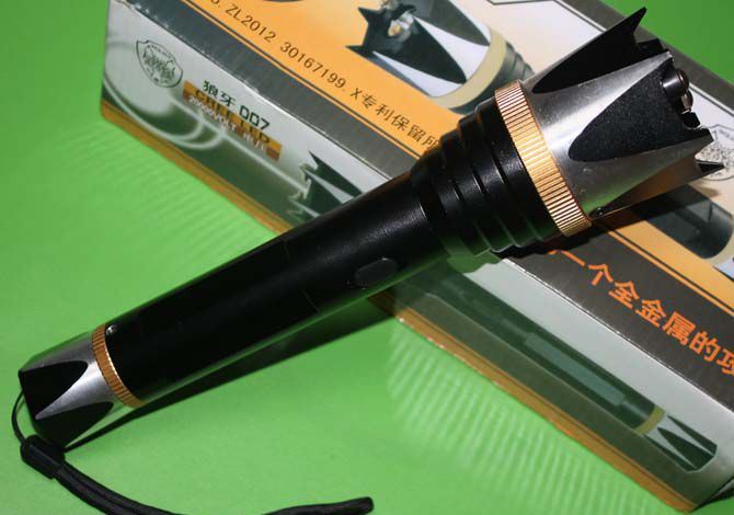 狼牙007高压电棍带强光电筒 产品参数: 尺寸:长24厘米*头部直径5.5厘米*尾部直径3厘米 电压:20万伏 照明:100米左右。强光+弱光+爆闪 颜色:黑色 材质:航空铝合金材质外壳,金属防卫攻击头 灯泡:进口LED灯珠,铝合金内饰灯杯 功能:电击+z照明,可击碎钢化玻璃 电池:内置的镍氢电池 用途:适合家用防身,旅游,野营,野外探险,商务馈赠