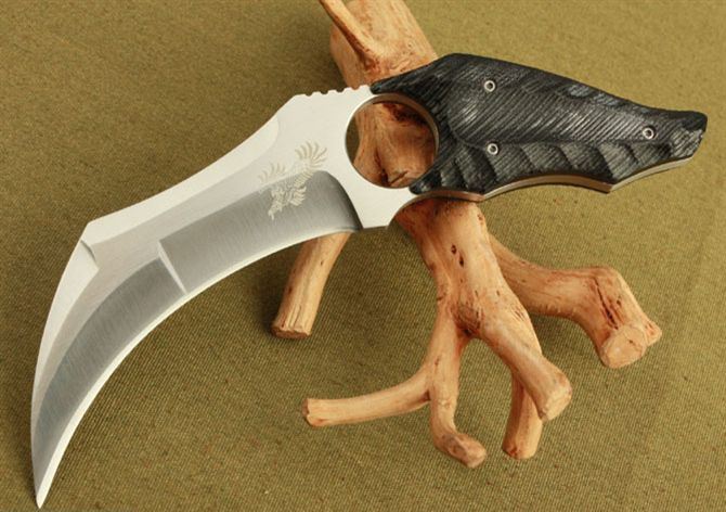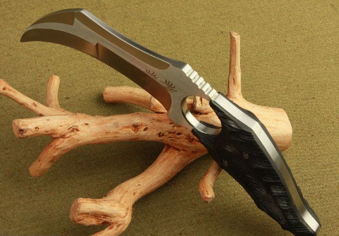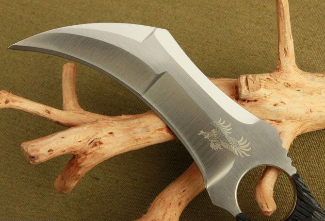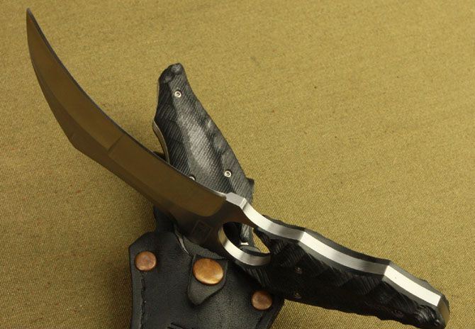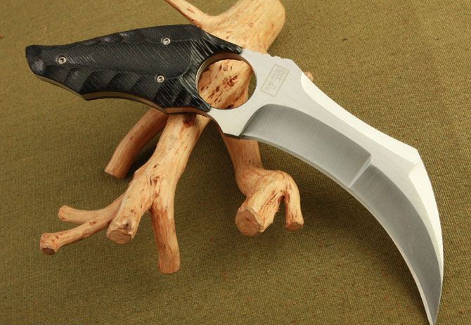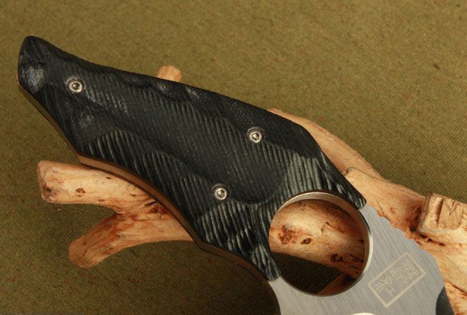 漠江—镰爪 全 长: 19cm 刃 长: 11cm 刃 宽: 3cm (最宽处) 刃 材: 7Cr17 硬 度: 57HRC 表 面: 砂光 刃 厚: 0.52cm 柄 长: 8.8cm 柄 材: 黑G10 重 量:225克(含鞘)