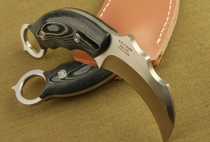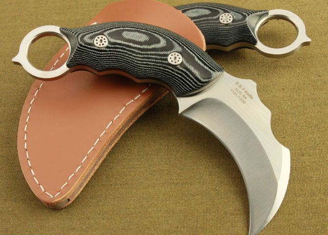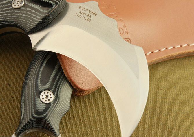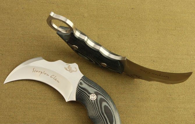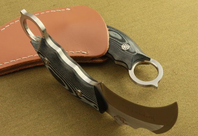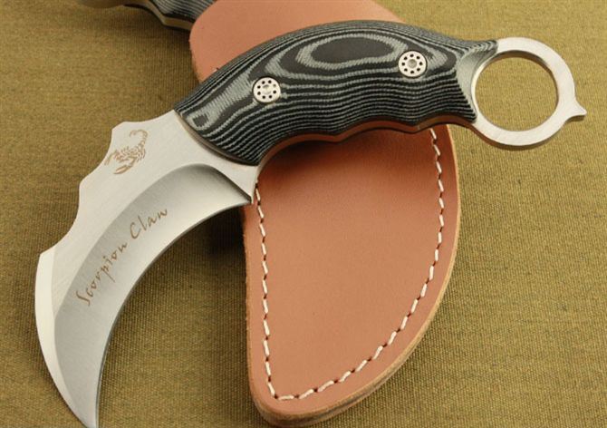 蝎子-神行者爪子(米卡塔) 全 长 :16cm 刃 长 :7.9cm 刃 厚 :5mm 刃 材 :AUS-8A 柄 材 :鹿角 硬 度 :59Hrc 表 面 :金属拉丝 刀 套 :牛皮 净 重 :195g