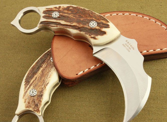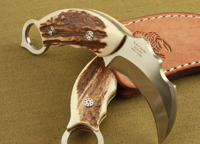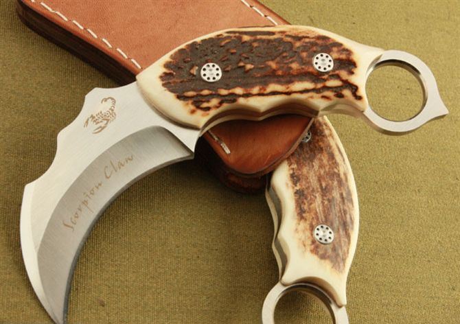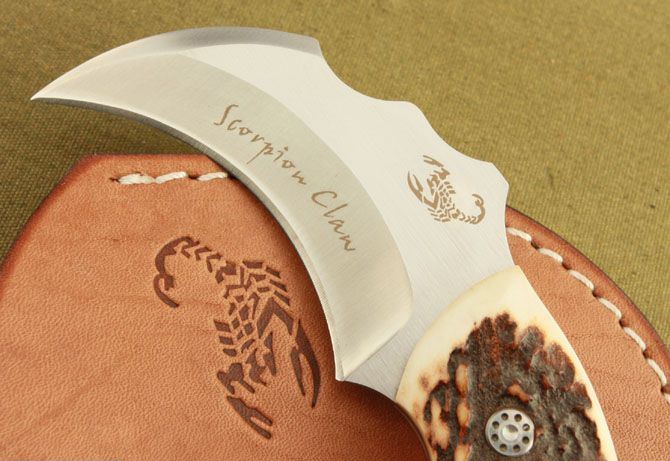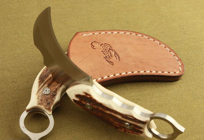 蝎子-神行者爪子(鹿角) 全 长: 16cm 刃 长: 7.9cm 刃 厚: 0.5CM 刃 材: AUS-8A 柄 材: 鹿角 硬 度: 59Hrc 表 面: 拉丝 净 重: 195g 刀 套: 牛皮