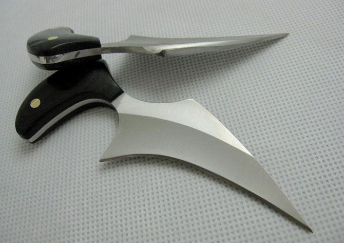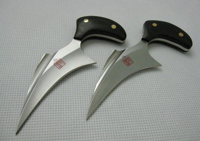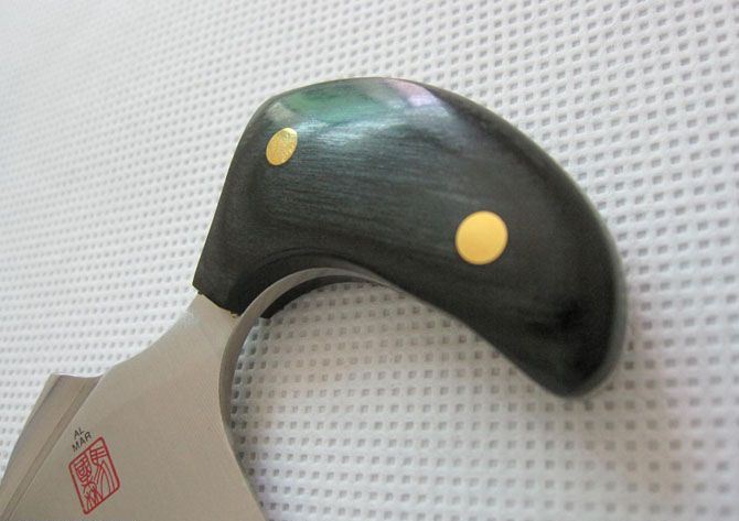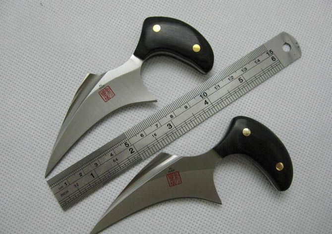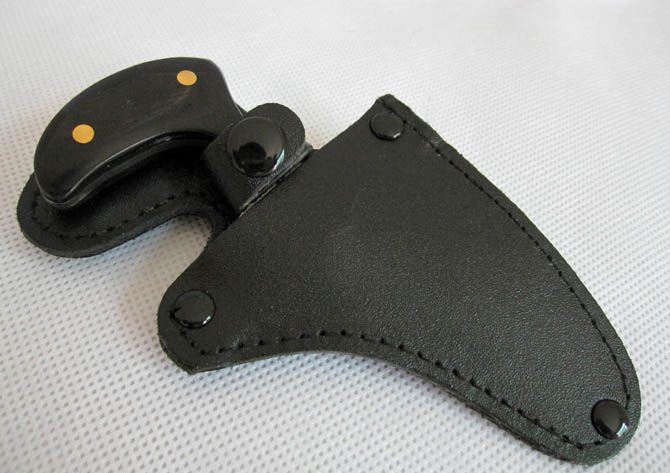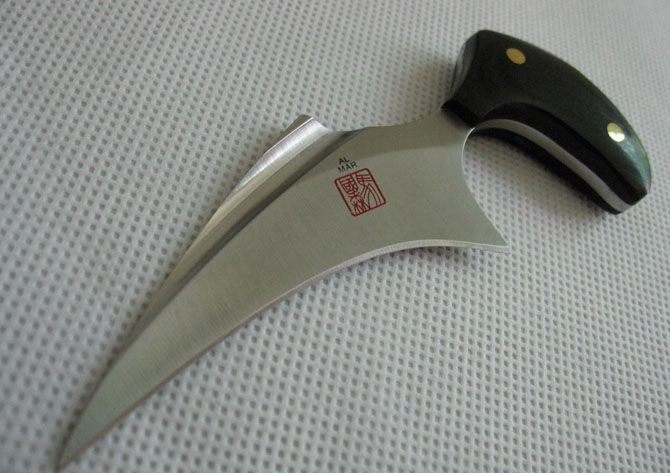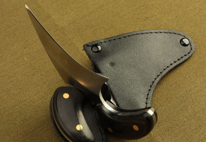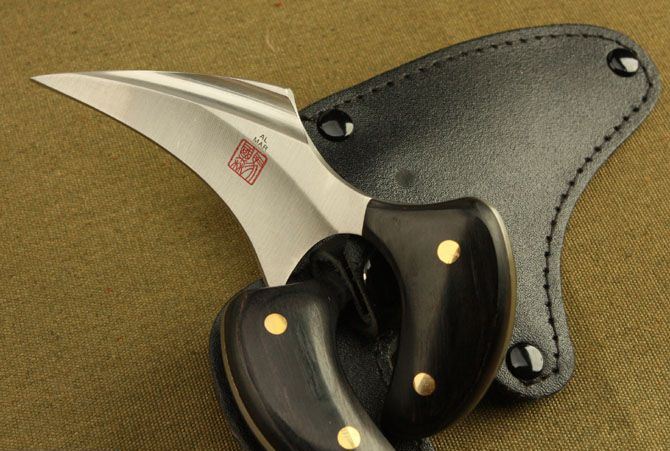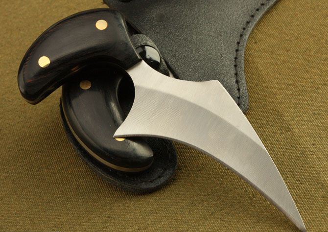 马国森—防卫爪刀(小号) 全 长: 12cm 刃 长: 7.5cm 刃 宽: 3.6cm (最宽处) 刃 材: 3Cr13 硬 度: 56HRC 表 面: 砂光 刃 厚: 0.28cm 柄 长: 4.8cm 柄 材: 黑木 重 量: 101克(含鞘和纸盒)