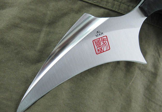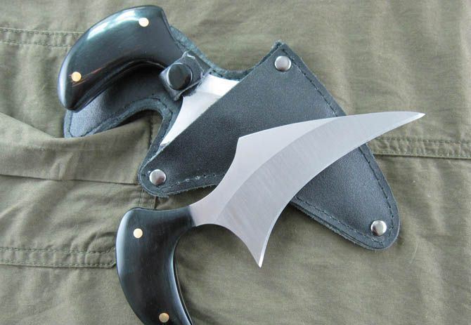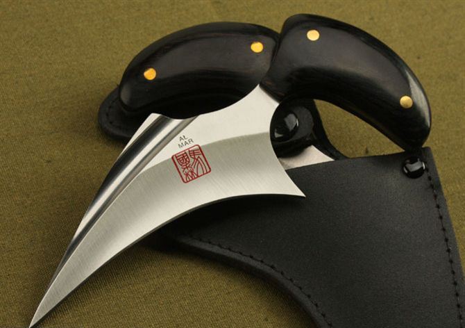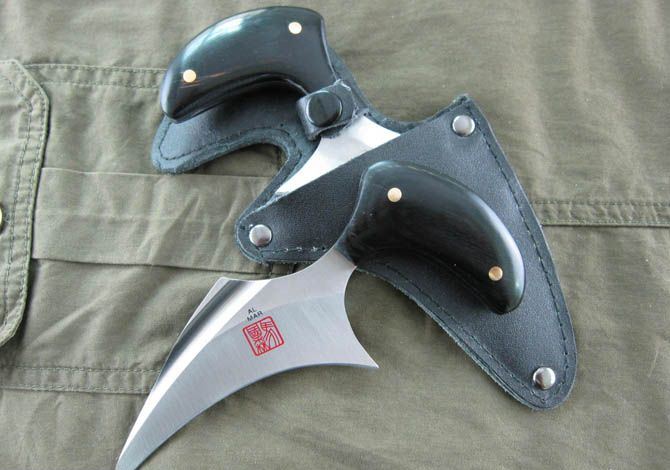 马国森—防卫爪刀(大号) 全 长:16.0cm 刃 长:10.0cm 柄 长:5.0cm 刃 宽:5.5cm(最宽处) 刃 厚:3.3mm 刃 材:440 硬 度:55HRC 刀 柄:黑木柄片 表 面:砂光 重 量:140.0克 备 注:带皮套