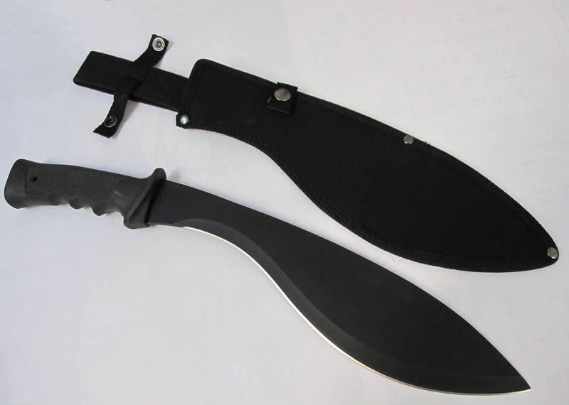 KA-BAR大狗腿砍刀 全长:44CM 刃长:31CM 刃宽:7CM (最宽处) 刃厚:0.3MM 硬度:56HRC 重量:600克(含套) 材质:420不锈钢 涂层:黑砂 柄材:塑胶,刀身贯穿至刀柄底部圆孔处 刀鞘:尼龙套