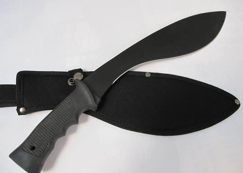 全长:44CM 刃长:31CM 刃宽:7CM (最宽处) 刃厚:0.3MM 硬度:56HRC 重量:600克(含套) 材质:420不锈钢 涂层:黑砂 柄材:塑胶,刀身贯穿至刀柄底部圆孔处 刀鞘:尼龙套