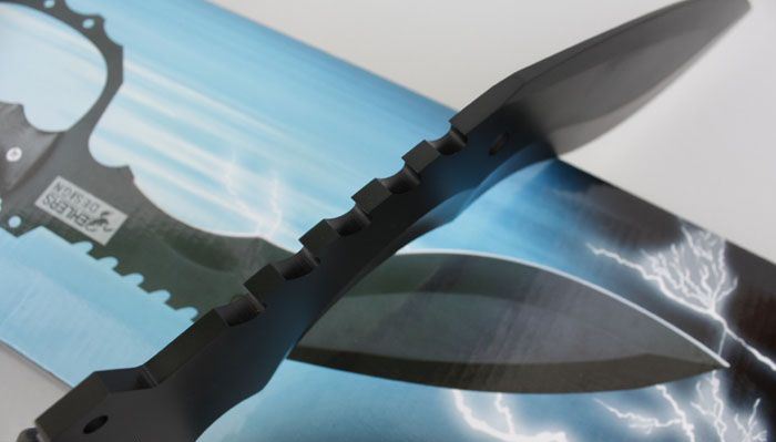 全长:46.6cm 刃长:29cm 刃宽:6.5cm 刃厚:0.52cm 刃材:440C高级不锈钢 硬度:57HRC 表面:电泳处理(防锈硬度高) 柄材:玻纤亚麻高压复合材料 柄长:13.8cm 品质:高品质,刃口非常锋利 附件:专用战术真皮刀套和彩合