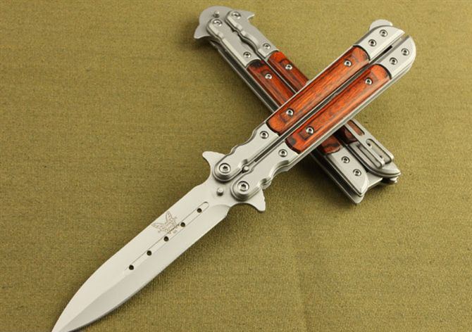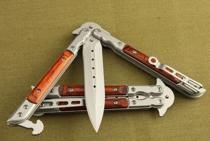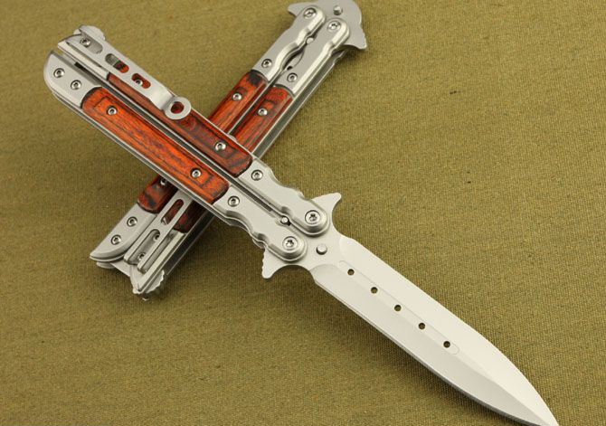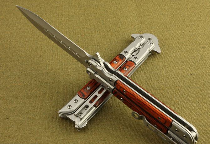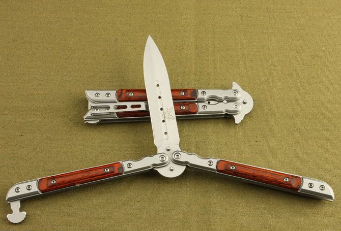 蝴蝶国产007甩刀 全长:22.5cm 刃长:10cm 柄长:12.5cm 刃宽: 1.9cm 刃厚:0.26cm 刃材: 5Cr13MoV 柄材: 彩木+钢头 硬度: 56HRC 重量: 140克 表面处理: 灰钛