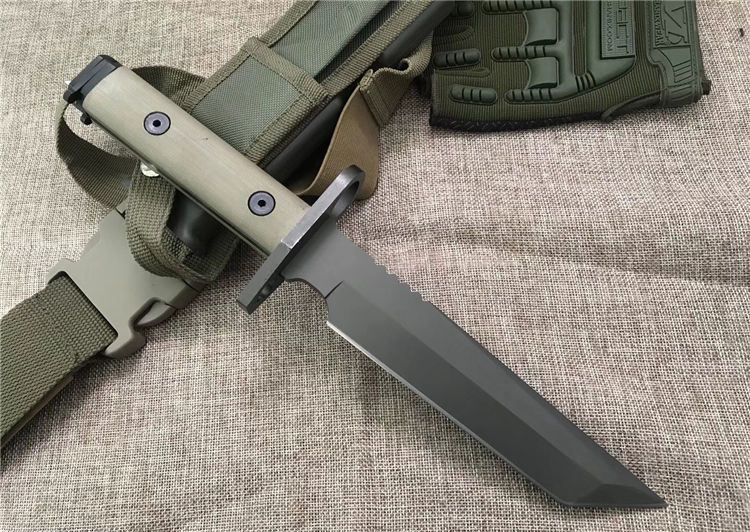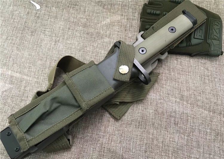 新版Bayonet D8枪刺 全 长: 32cm 刃 长: 16cm 刃 宽: 3.7cm(最宽处) 柄 长: 13cm 刃 材: D2钢 硬 度: 58-59HRC 表 面: 钛离子 刃 厚: 0.60cm 柄 材: 龙骨结构,绿色G10柄片 净 重: 560g 总 重: 1040g(包括纸盒和刀鞘) 包 装: 原装纸盒 其 他: 配附ABS刀鞘 品 质: 品质卓越