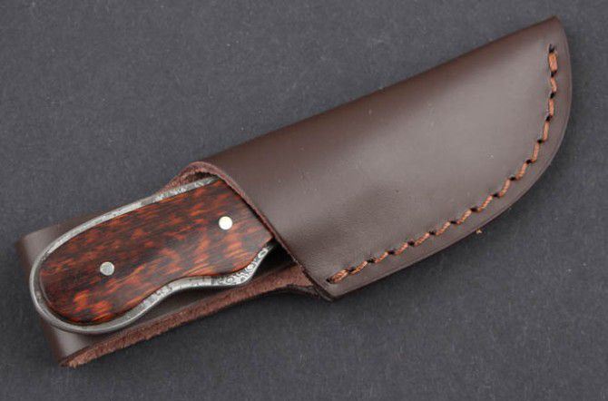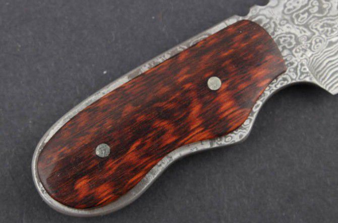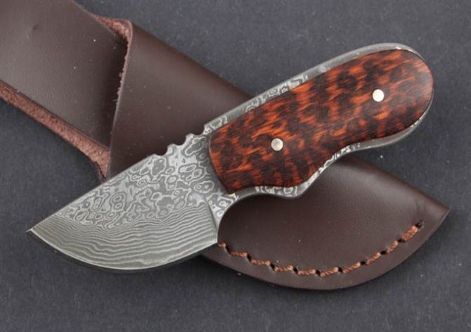 蛇纹木-大马士革迷你小匕首 全 长:103mm 刃 长:45mm 柄 长:53mm 刃 宽:25mm 刃 厚:2.6mm 刃 材:大马士革 重 量:70g(含包装) 硬 度:58HRC 表 面:大马士革原纹 柄 材:一体钢+蛇纹木 锁 型:定锁 其 他:配牛皮套