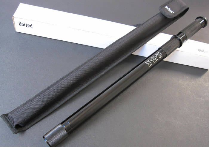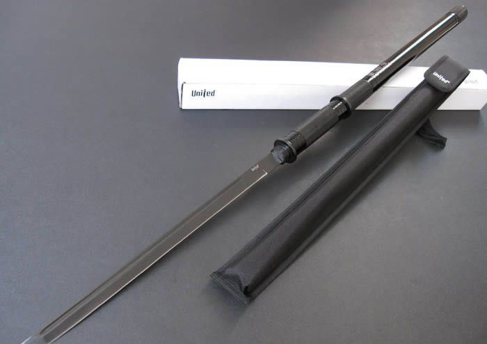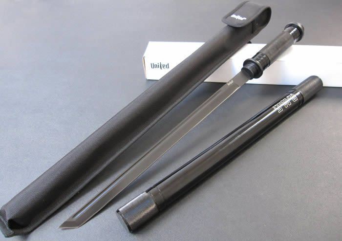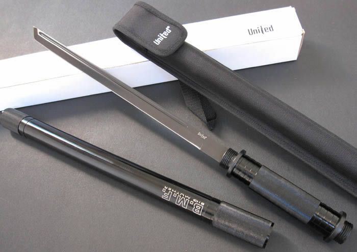 联合刀具.防暴警棍刀(升级版) 完全反接长度:95CM 刃长:37.2CM 完全正合长度:57.5CM 管径:3.25CM 刀厚:0.4CM 刃宽: 2.2CM 重量: 1000g 硬度: 56HRC 刀材质:440不锈钢 管材: 合金铝 柄材: 合金铝 表面:黑钛(不易刮花) 其他:双面血槽,武士刀头 配附高档耐磨加厚尼龙套