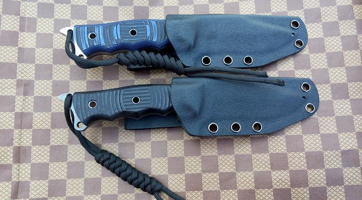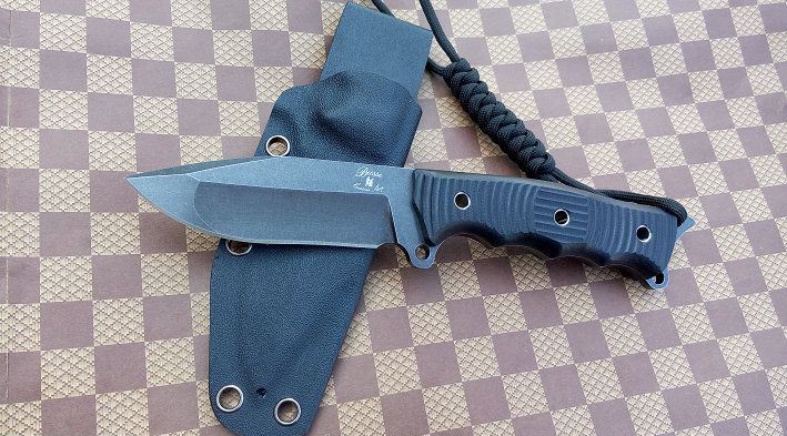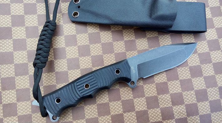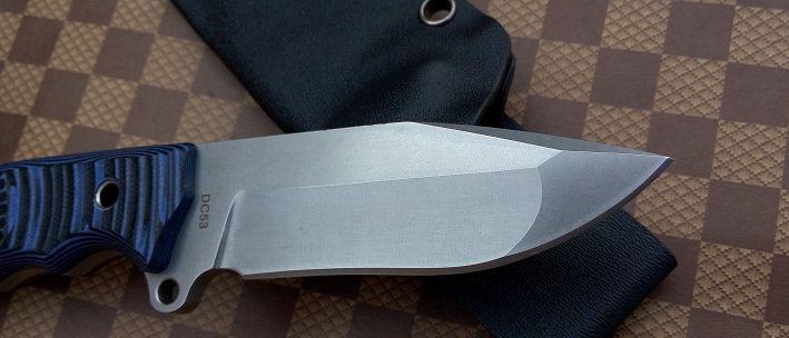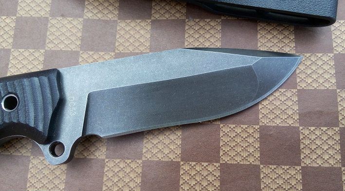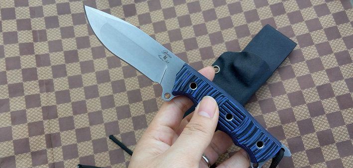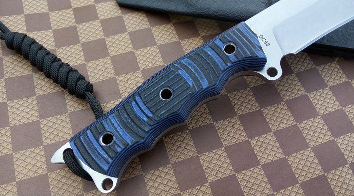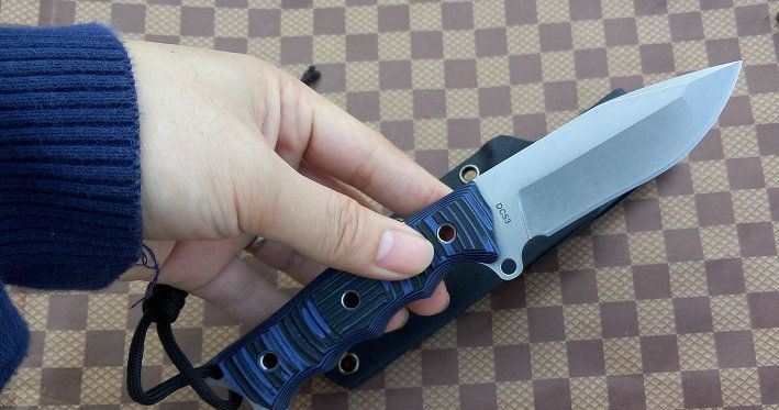 材质:DC53 全长:21.2cm 刃长:8.5cm 刃厚:0.5cm 刃宽: 3cm 重量: 230克 表面:石洗和沧桑石洗 硬度:61HRC(真空热处理) 手柄:G10,CNC 成型 刀鞘:战术K鞘(进口Kydex板)