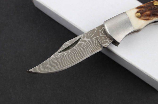 全 长: 8.8cm 刃 长: 3.9cm 刃 宽: 1.0cm(最宽处) 闭 合: 4.9cm 硬 度: 59HRC 刃 厚: 0.21cm 重 量: 250克 表 面: 纯手工制造 刃 材: 大马士革 柄 材: 钢+鹿角 其 他: 刃口锋利 大马士革钢花纹和把手木纹及颜色各异,以实物为准