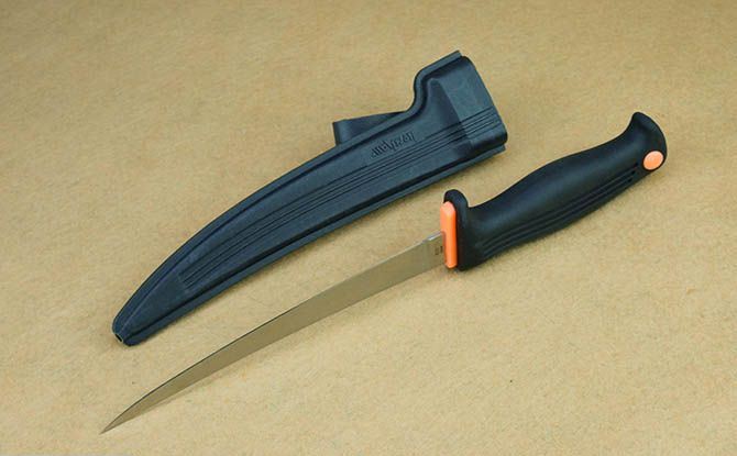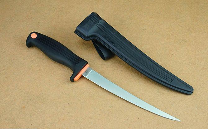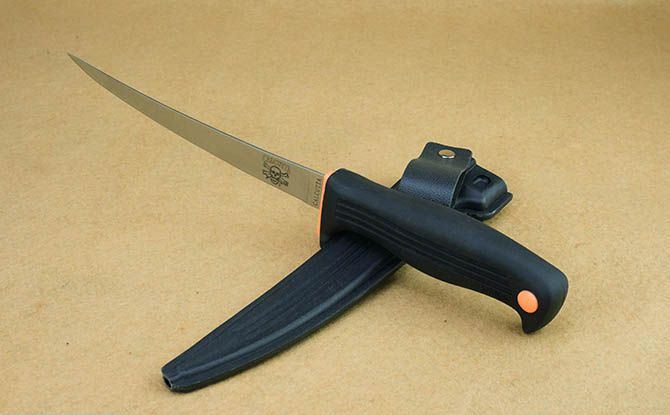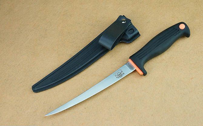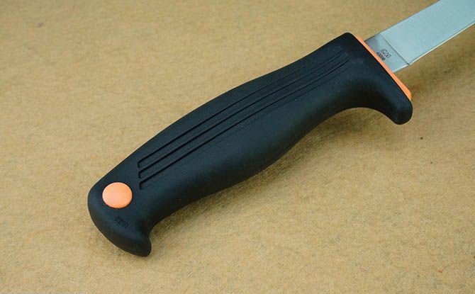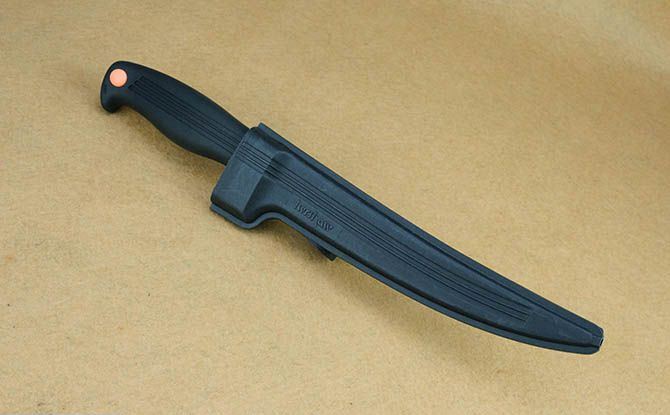 克秀43006鱼刀 全 长:31cm 刃 长:18cm 刃 宽:2cm(最宽处) 刃 厚:0.19mm 柄 长:13cm 表 面: 砂光 刃 材: 440 硬 度: 57HRC 柄 材: 橡塑 重 量:134克(含鞘) 包 装:塑料硬鞘