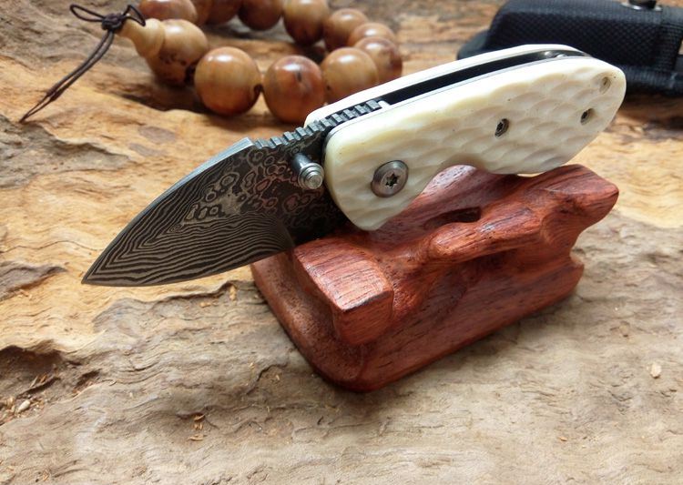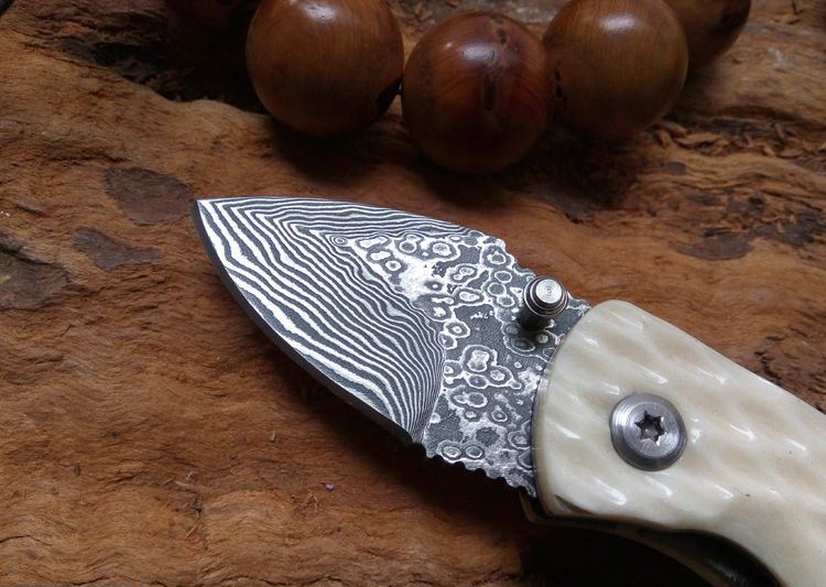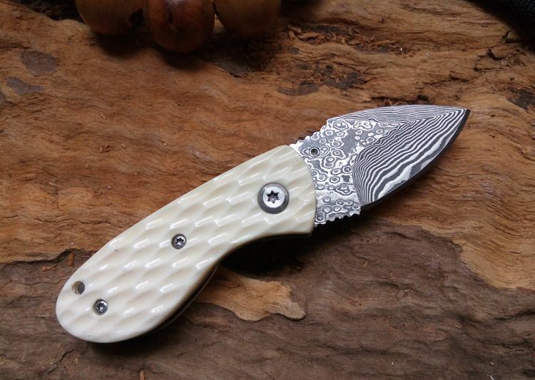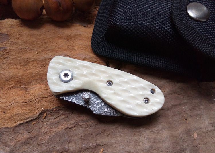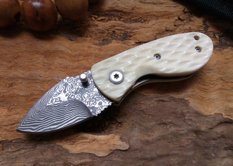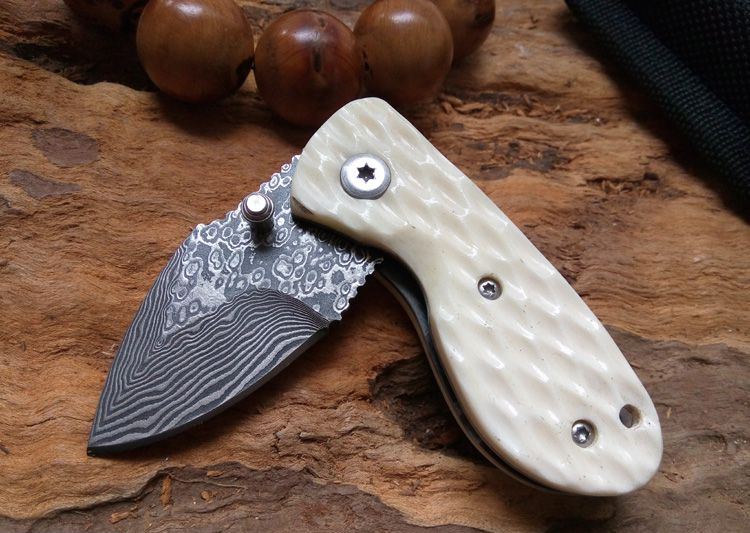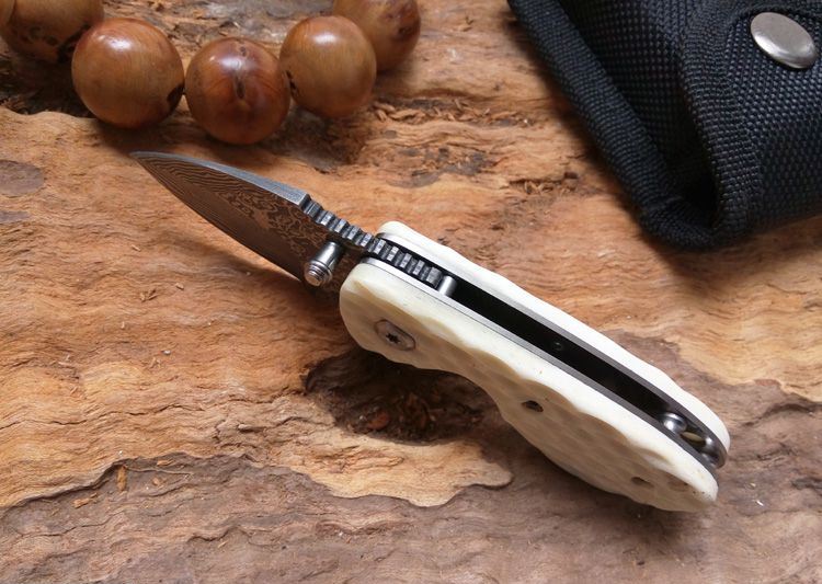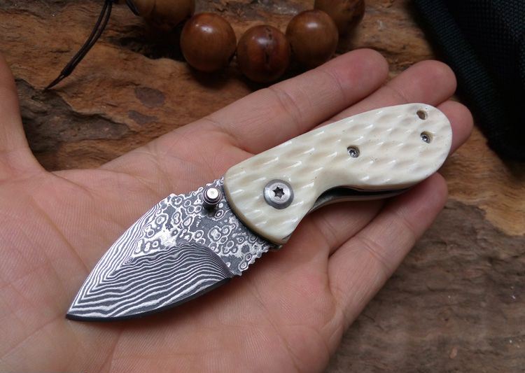兽骨大马士革-迷你小折刀 全 长:115mm 刃 长:45mm 柄 长:72mm 刃 宽:26mm 刃 厚:3mm 刃 材:大马士革 重 量:86g(含包装) 硬 度:58HRC 表 面:大马士革原纹 柄 材: 兽骨 锁 型:线锁 其 他:配尼龙套
