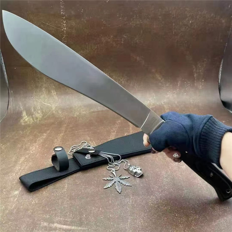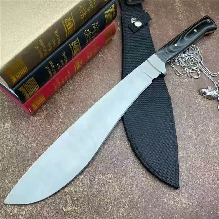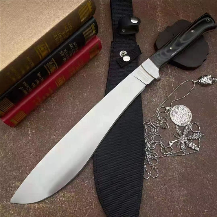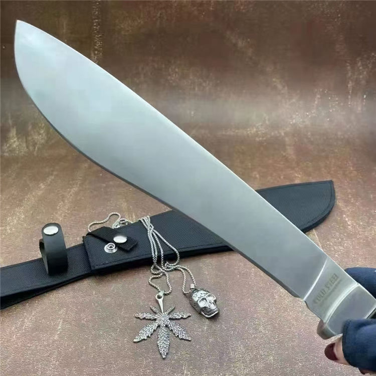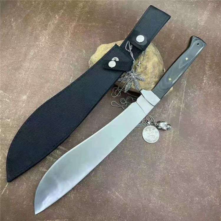 全长:44cm 刃长:29cm 刃宽:5.5cm(最宽处) 刃厚:0.58cm 刃材:440c 硬度:58HRC 表面:砂光 柄材:米卡塔 柄长:12.8cm 刀重:620克 总重:810克(含刀套和包装物) 附件:尼龙 包装:仿原装纸盒