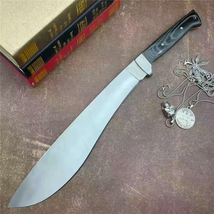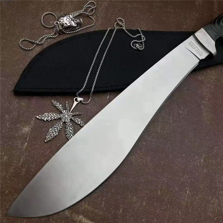 美国冷钢柳月弯刀 全长:44cm 刃长:29cm 刃宽:5.5cm(最宽处) 刃厚:0.58cm 刃材:440c 硬度:58HRC 表面:砂光 柄材:米卡塔 柄长:12.8cm 刀重:620克 总重:810克(含刀套和包装物) 附件:尼龙 包装:仿原装纸盒