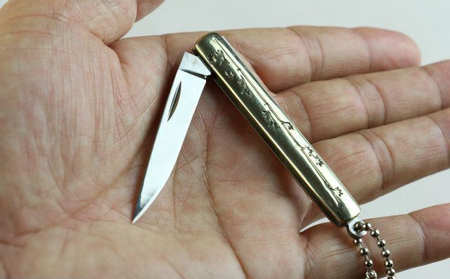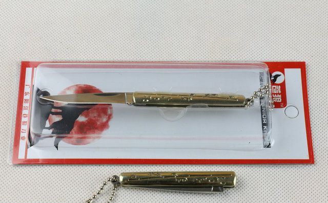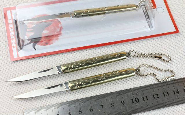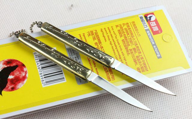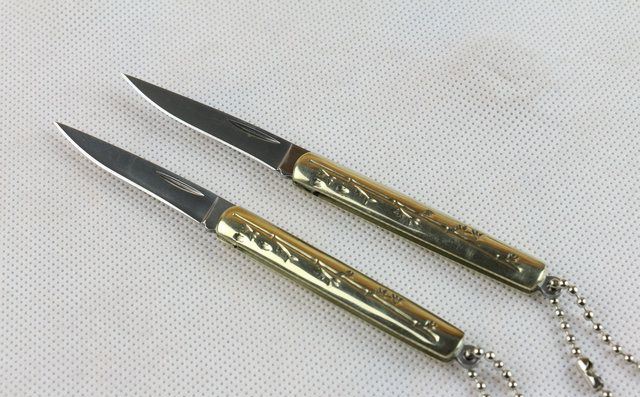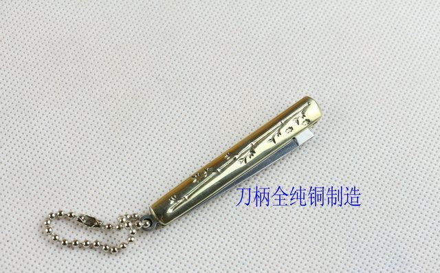 全长:12.2cm 刃长:5.1cm 刃宽:0.9cm 闭合:7cm 刃厚:0.8cm 钢材:440C 硬度:56HRC 净重:50g 表面:镜光 柄材:全纯铜竹叶花纹 锁型:无锁 包装:吸卡盒.国内著名品牌.