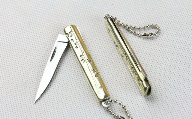 苍狼5905铜柄竹叶随身小刀 全长:12.2cm 刃长:5.1cm 刃宽:0.9cm 闭合:7cm 刃厚:0.8cm 钢材:440C 硬度:56HRC 净重:50g 表面:镜光 柄材:全纯铜竹叶花纹 锁型:无锁 包装:吸卡盒.国内著名品牌.