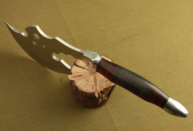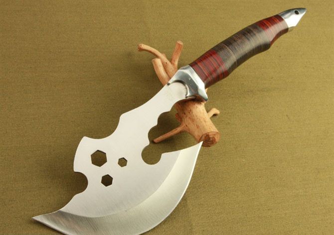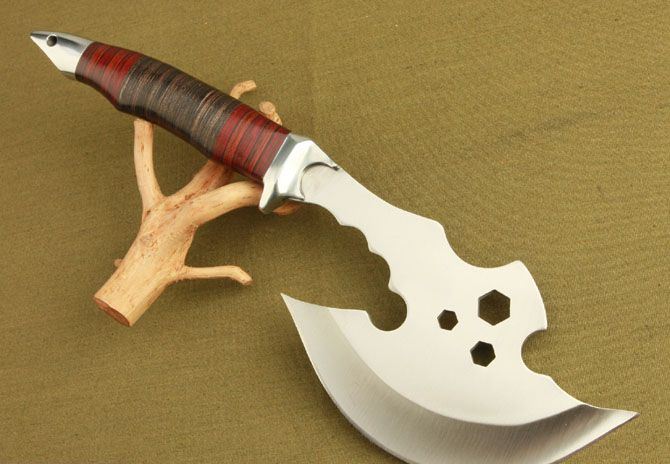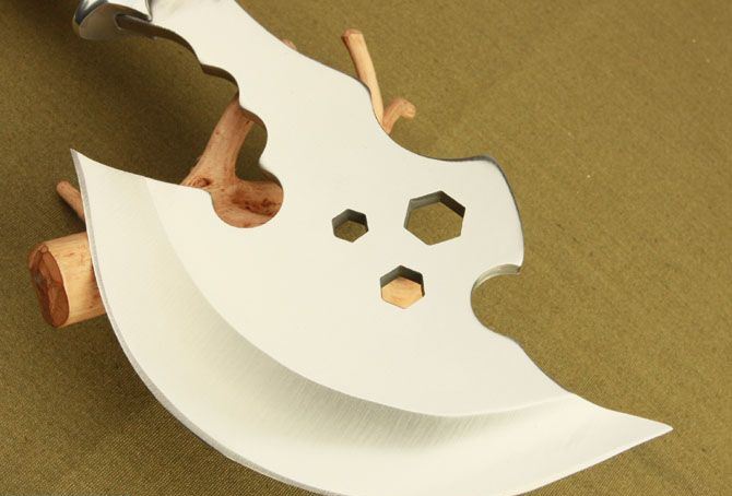 全 长: 37cm 刃 长: 17.5cm 柄 长: 18cm 刃 材: 440 不锈钢 硬 度: 56 HRC 表 面: 砂光 刃 厚: 5.6cm 净 重: 640g(含包装) 其 他:全刃开锋,附尼龙套