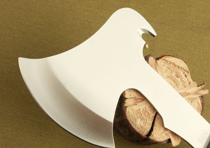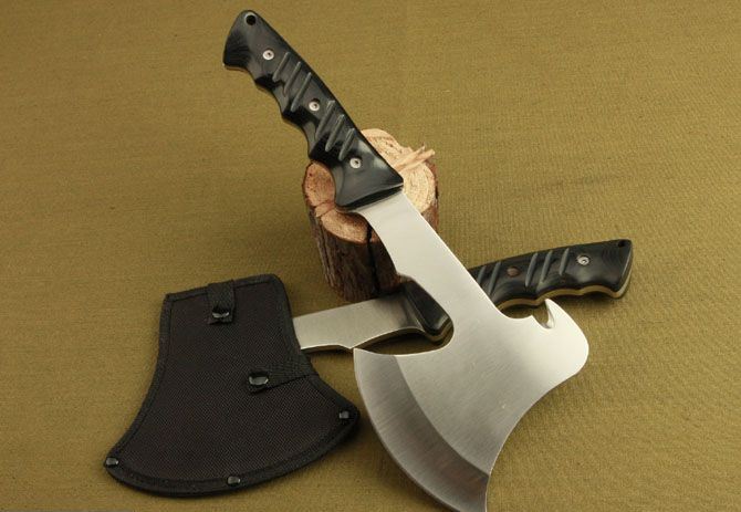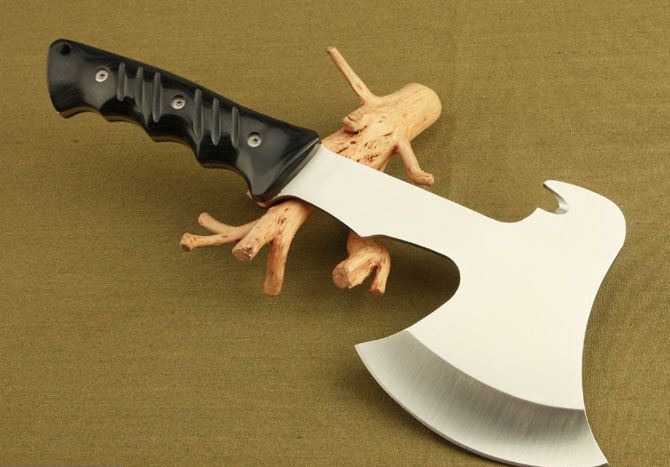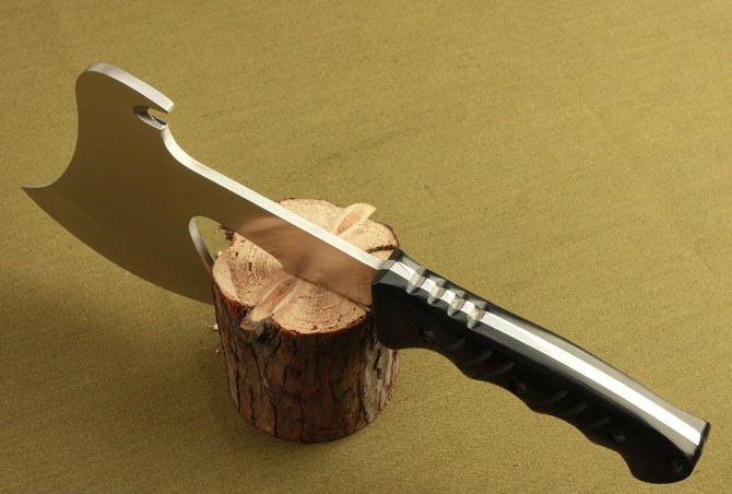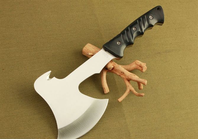 F705斧头 全 长: 32.5cm 刃 长: 12cm 柄 长: 14cm 刃 材: 440 不锈钢 硬 度: 56 HRC 表 面: 砂光 刃 厚: 5.6cm 净 重: 740g(含包装) 其 他:全刃开锋,附尼龙套