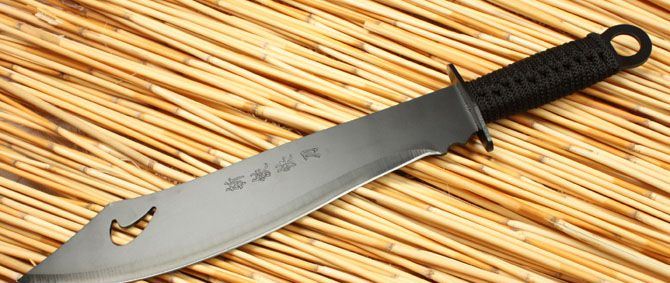 斩铁快刀 全长: 40CM 刃长: 25CM 刃宽: 5CM (最宽处) 刃厚: 0.28MM 硬度: 56HRC 重量: 380克(含套) 材质: 420不锈钢 涂层: 氧化黑 柄材: 尼龙绳子 刀鞘: 尼龙套