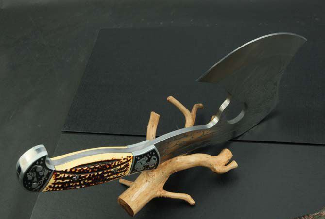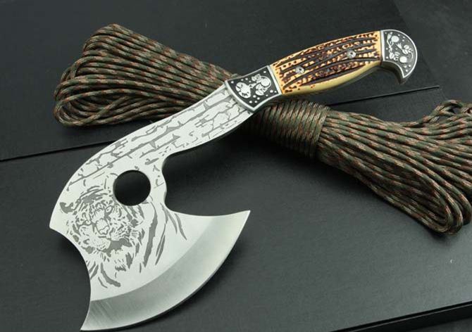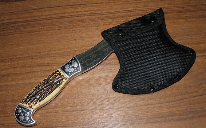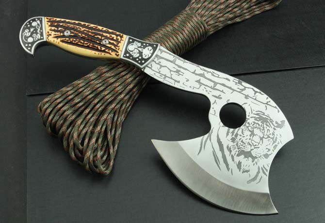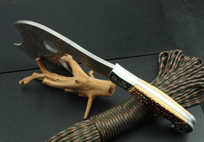 712斧头 全 长:310mm 刃 长:138mm 柄 长:140mm 刃 宽:122mm 刃 厚:5.8mm 刃 材:3Cr13Mov 重 量:770g(含包装) 硬 度:55HRC 表 面:腐蚀纹 柄 材:骨片 锁 型:定锁 其 他:配尼龙套和白盒