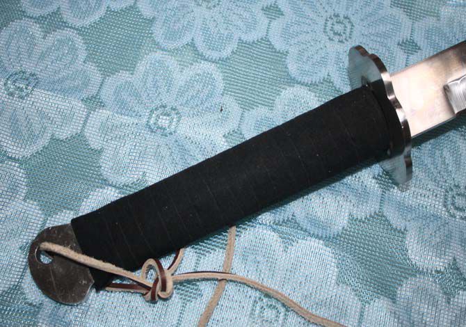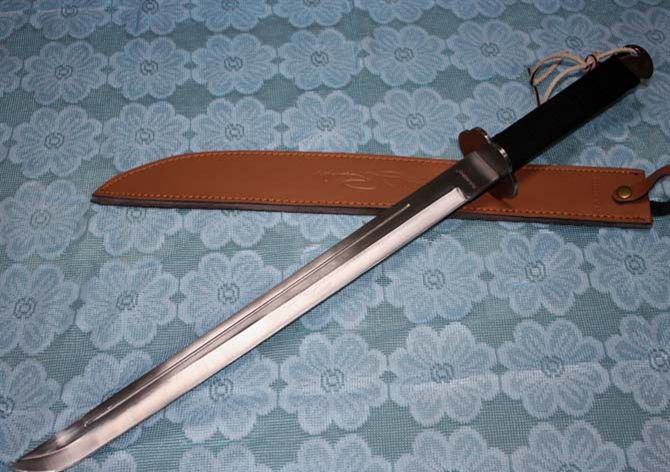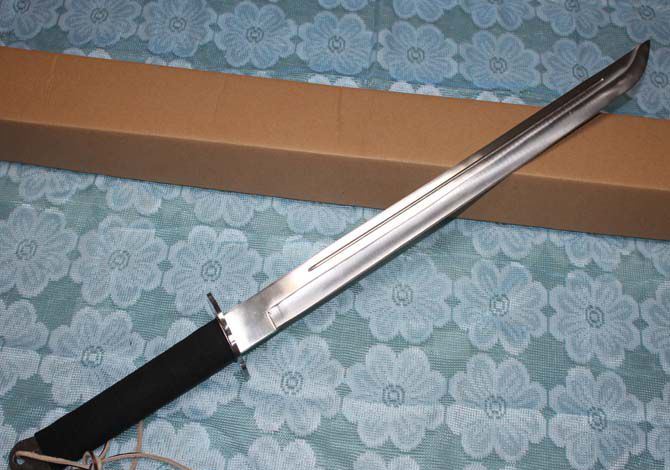 全 长:72.5cm 刃 长:46cm 柄 长:22cm 刃 厚:5mm 刃 宽: 3.6cm 刃 材: 3Cr13 柄 材: 龙骨注塑 硬 度: 55HRC 净 重:1000克 毛 重:1350克(含刀套) 刀 鞘;真皮套 表 面处理:钢本色 龙骨一体钢
