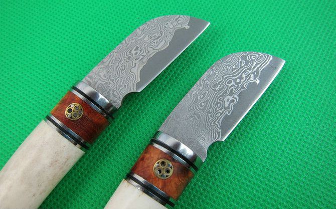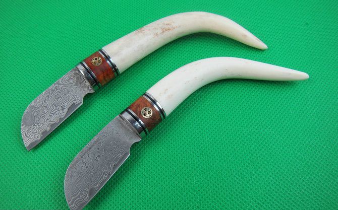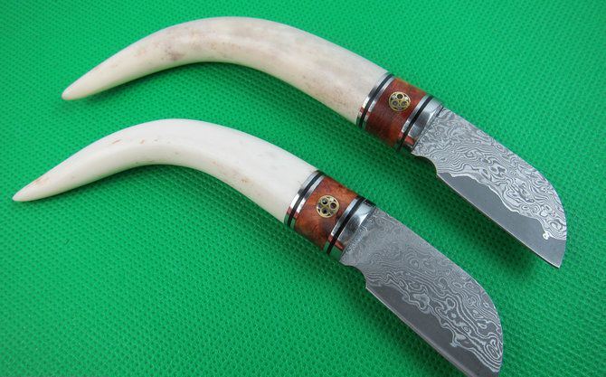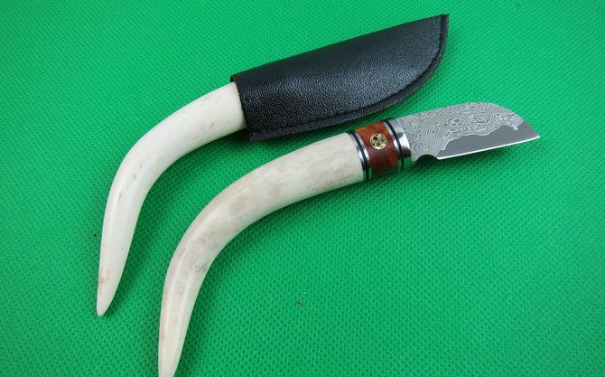 大马士革鹿角柄茶刀 全 长:15cm 刃 长:4cm 柄 长:长度不一样 刃 宽:2.2cm(最宽处) 刃 厚:2.1mm 刃 材:大马士革钢 硬 度:58HRC 刀 柄:钢头(精镶)红影林+珍贵鹿角 表 面:大马士革花纹 刀 重:50克 备 注:配人革套