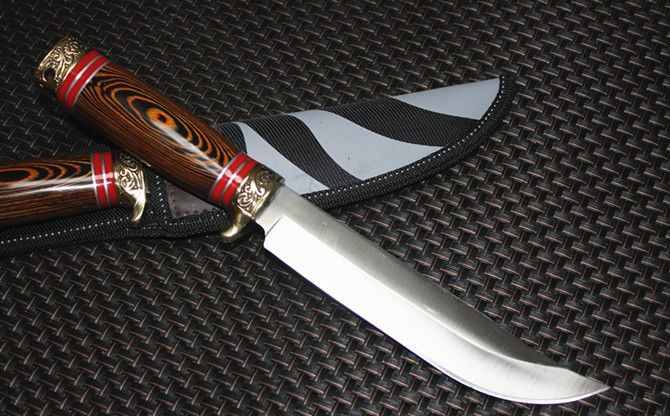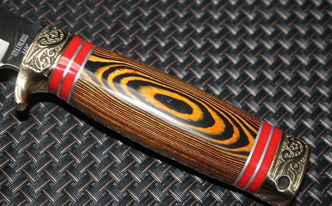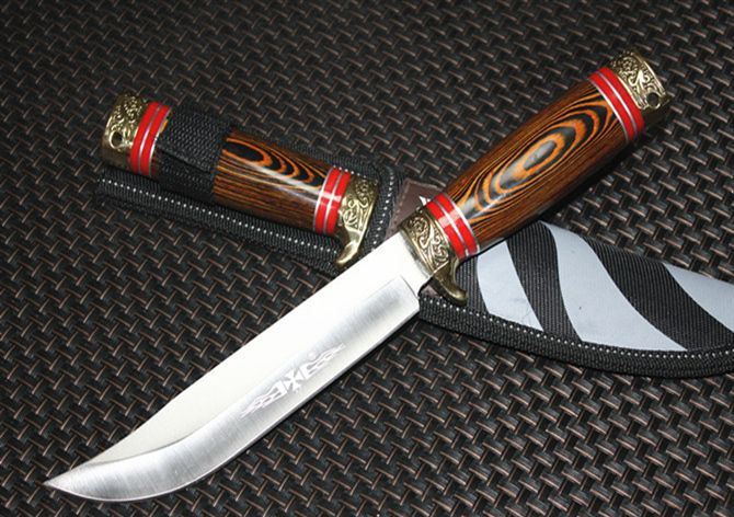 神象彩木猎刀2号(双铜头) 全长:29.5CM 刃长:16.5CM 刃材:440C 硬度:55HRC 刃厚:0.38CM 刃宽:3CM (最宽处) 柄长:13CM 重量:310g 涂层:砂光 柄材:彩木+铜头 刀鞘:尼龙套