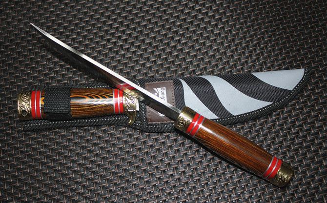 全长:29.5CM 刃长:16.5CM 刃材:440C 硬度:55HRC 刃厚:0.38CM 刃宽:3CM (最宽处) 柄长:13CM 重量:310g 涂层:砂光 柄材:彩木+铜头 刀鞘:尼龙套